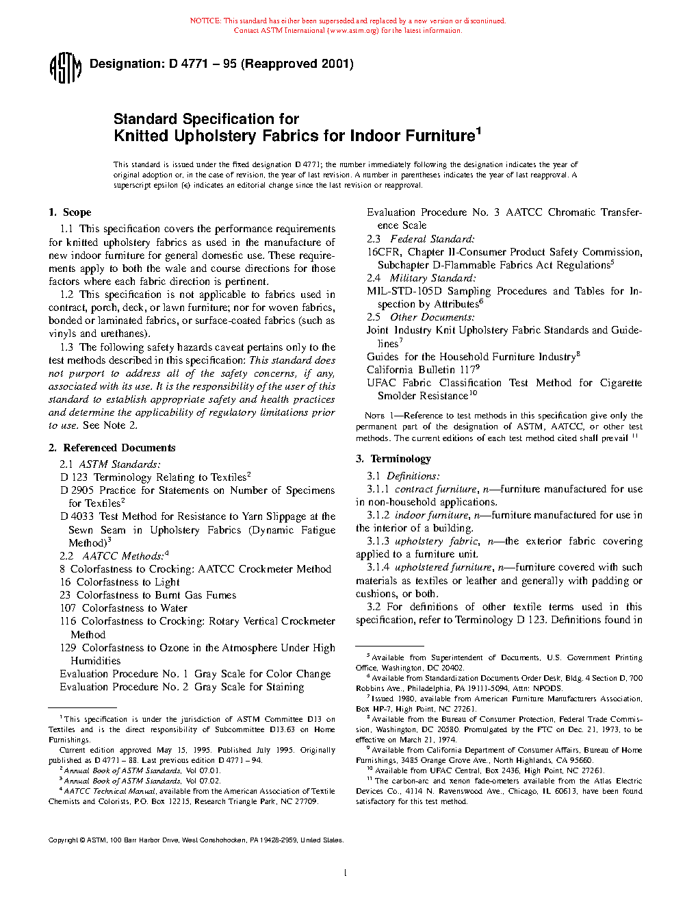 This performance specification covers the performance requirements for knitted upholstery fabrics as used in the manufacture of new indoor furniture for general domestic use. These requirements apply to both the wale and course directions for those factors where each fabric direction is pertinent. This performance specification is not applicable to fabrics used in contract, porch, deck, or lawn furniture; nor for woven fabrics, bonded or laminated fabrics, or surface-coated fabrics (such as vinyls and urethanes). The fabric shall be tested for its resistance to yarn slippage, dimensional change, and colorfastness to water, solvent, crocking, burnt gas fumes, light, and ozone. After the fabric has been tested, it shall be evaluated for any change in hand, character, or appearance. The fabric shall be evaluated for cracking or peeling of the back coating to check the coating durability. The fabric flammability shall also be tested. All upholstery fabrics shall be evaluated for cigarette ignition resistance.