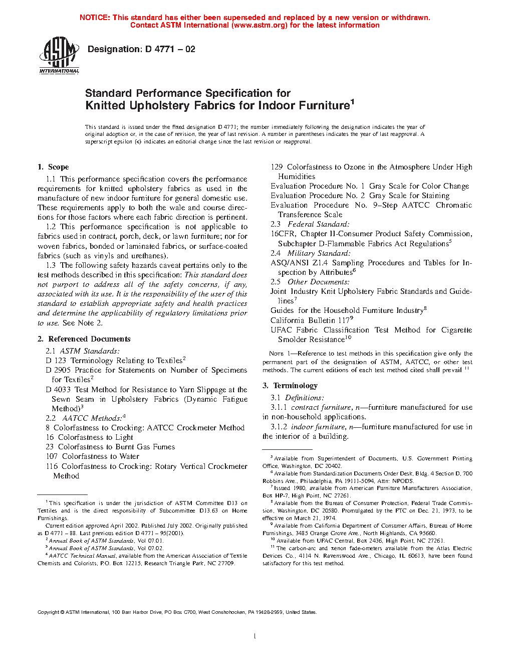 1.2 This performance specification is not applicable to fabrics used in contract, porch, deck, or lawn furniture; nor for woven fabrics, bonded or laminated fabrics, or surface-coated fabrics (such as vinyls and urethanes).