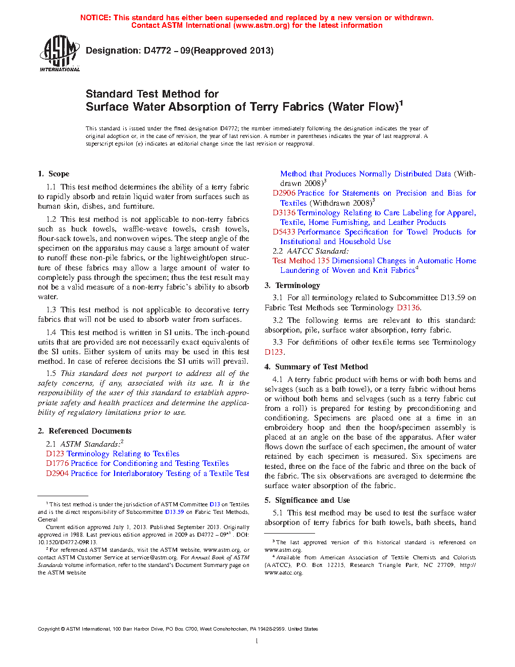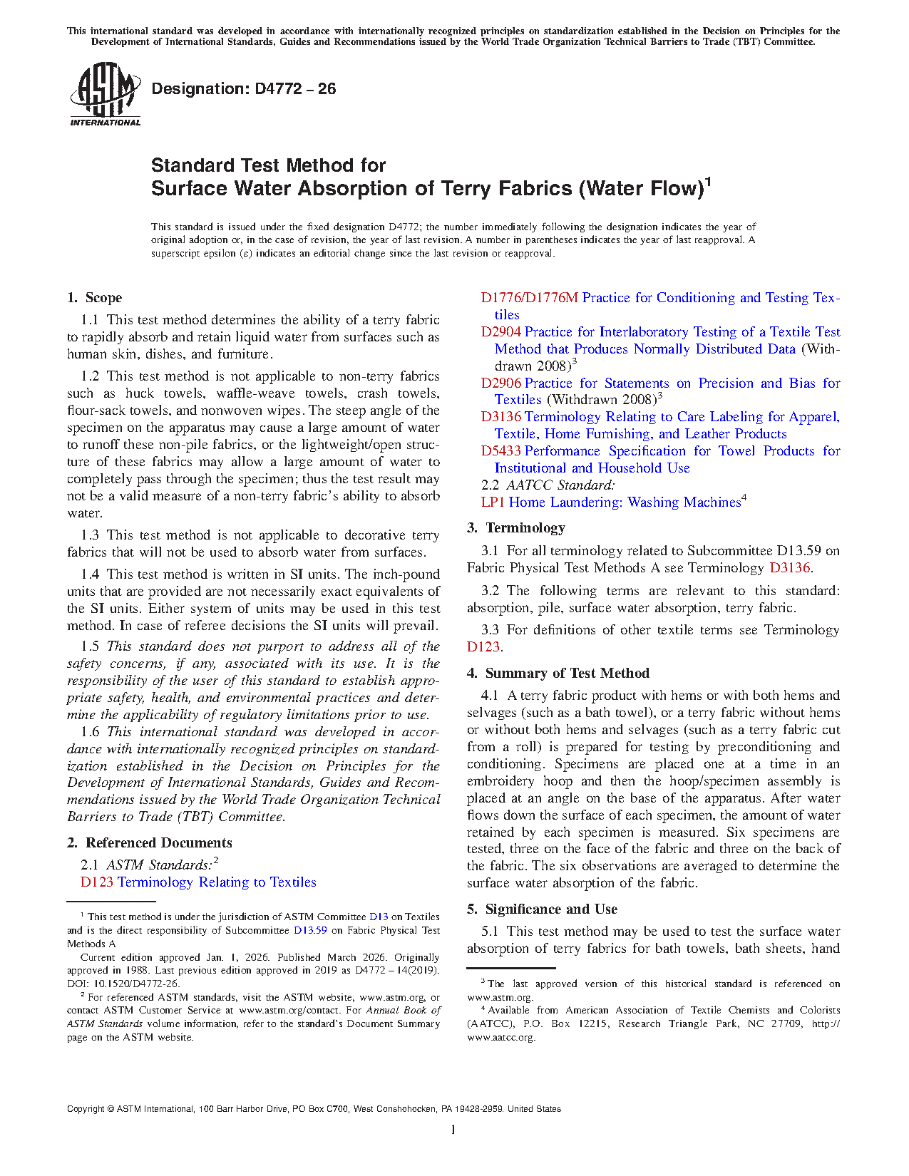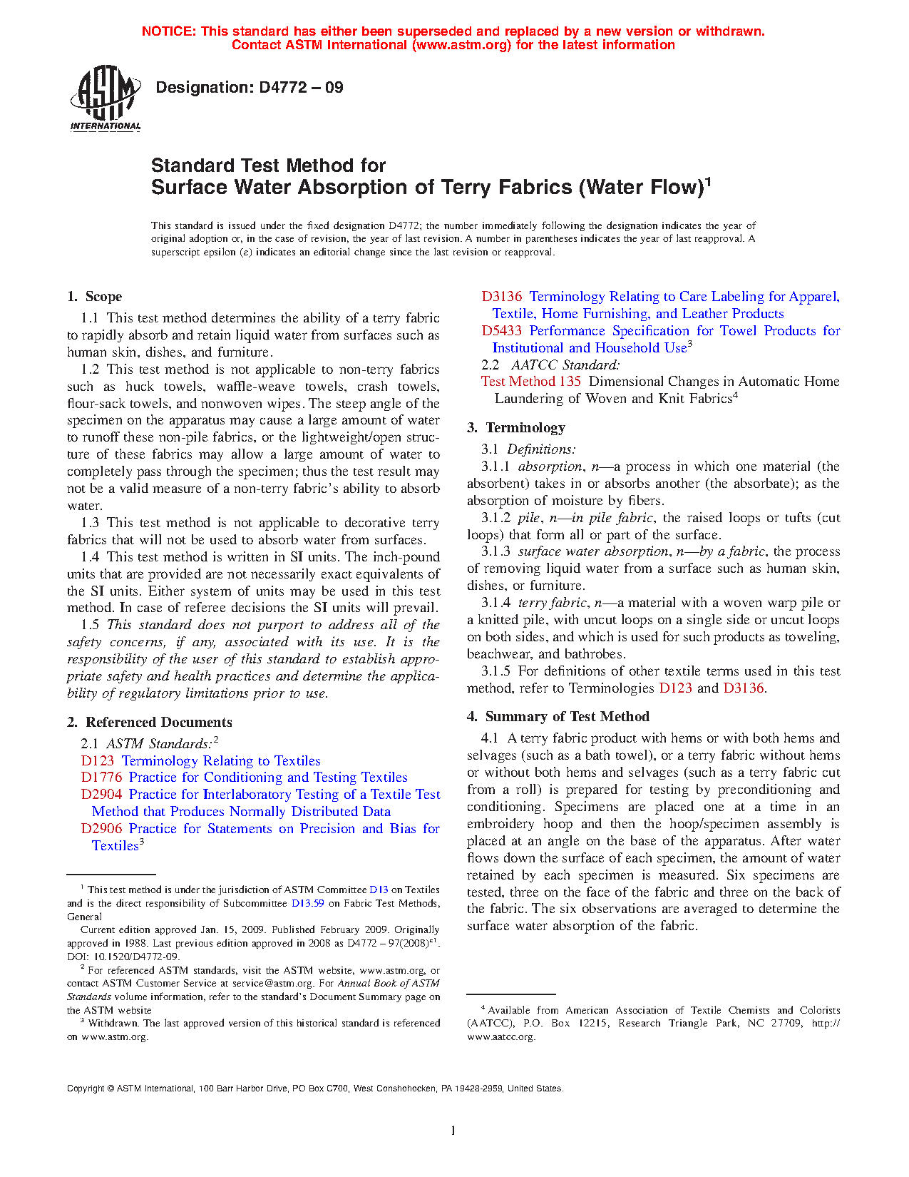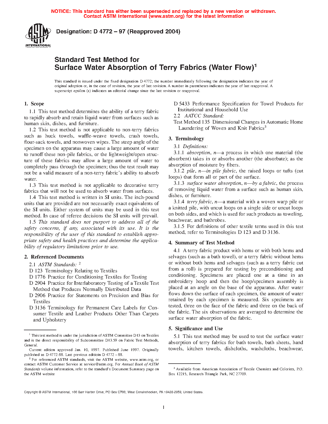 This test method may be used to test the surface water absorption of terry fabrics for bath towels, bath sheets, hand towels, kitchen towels, dishcloths, washcloths, beachwear, bathrobes, and the like. Different specifications may be needed for each of these fabrics because of different applications.