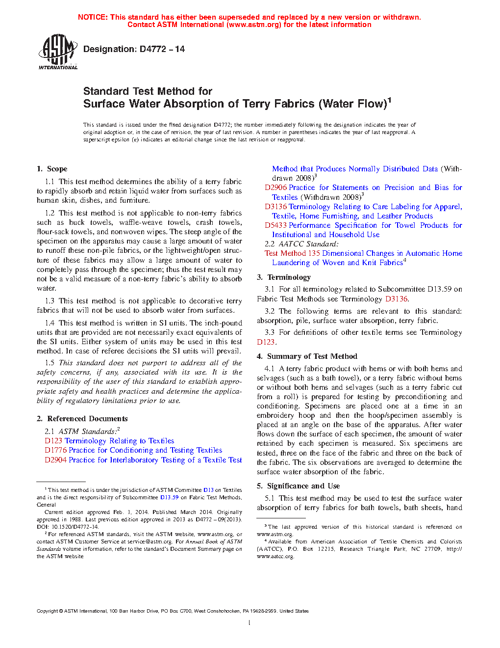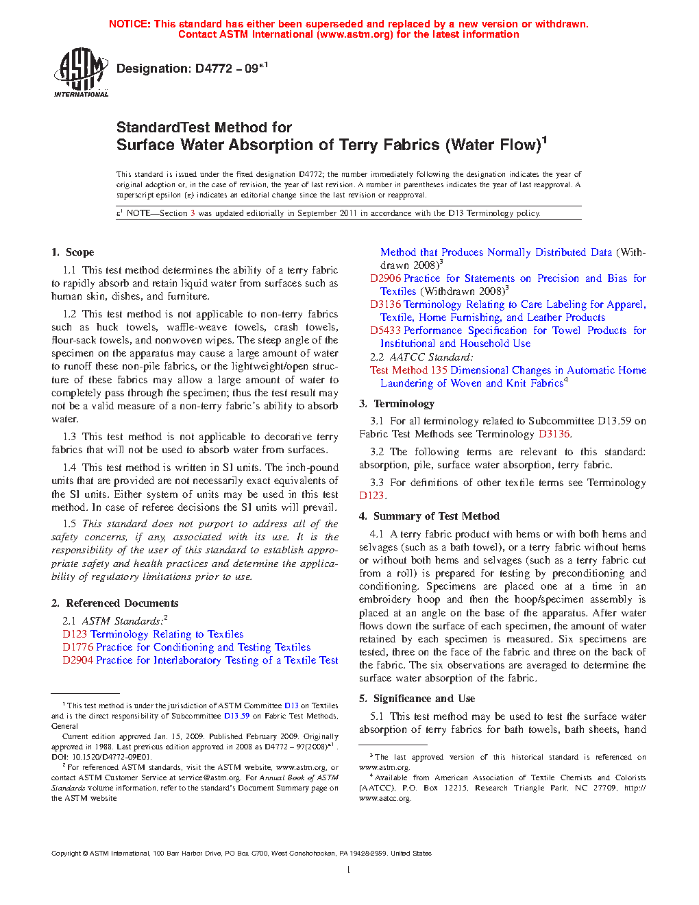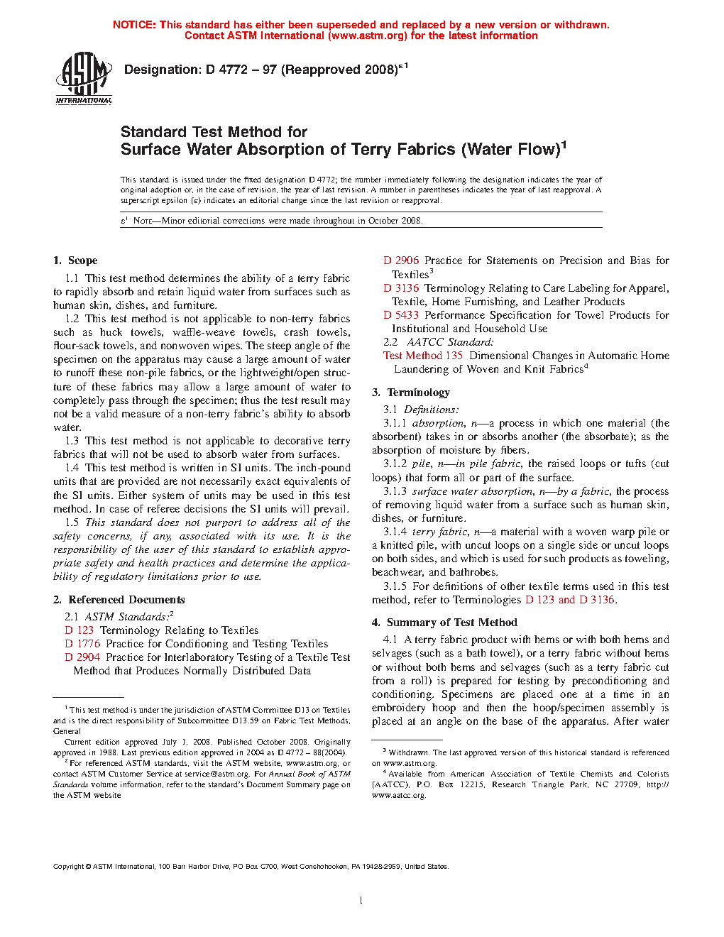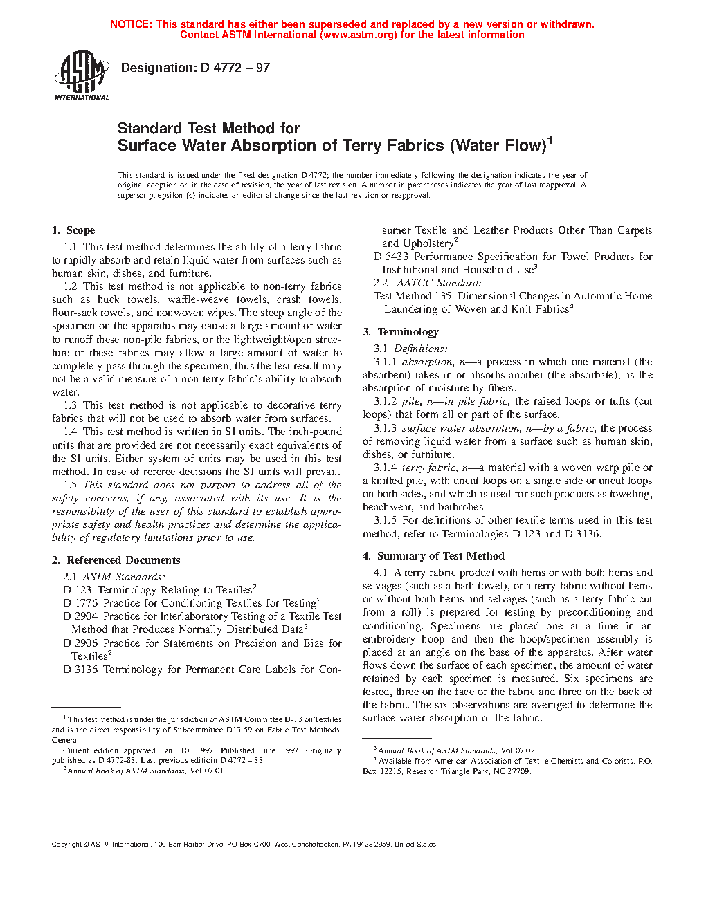 This test method may be used to test the surface water absorption of terry fabrics for bath towels, bath sheets, hand towels, kitchen towels, dishcloths, washcloths, beachwear, bathrobes, and the like. Different specifications may be needed for each of these fabrics because of different applications.