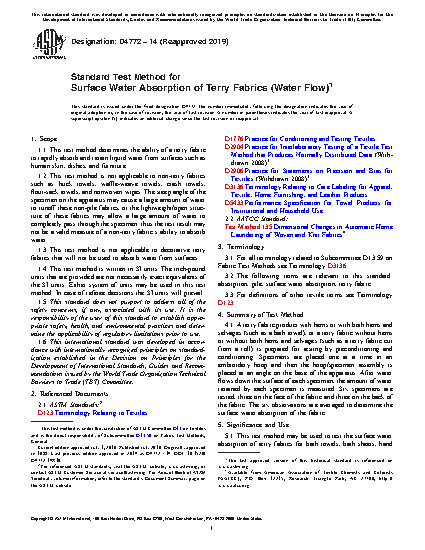 1.2 This test method is not applicable to non-terry fabrics such as huck towels, waffle-weave towels, crash towels, flour-sack towels, and nonwoven wipes. The steep angle of the specimen on the apparatus may cause a large amount of water to runoff these non-pile fabrics, or the lightweight/open structure of these fabrics may allow a large amount of water to completely pass through the specimen; thus the test result may not be a valid measure of a non-terry fabric's ability to absorb water.
