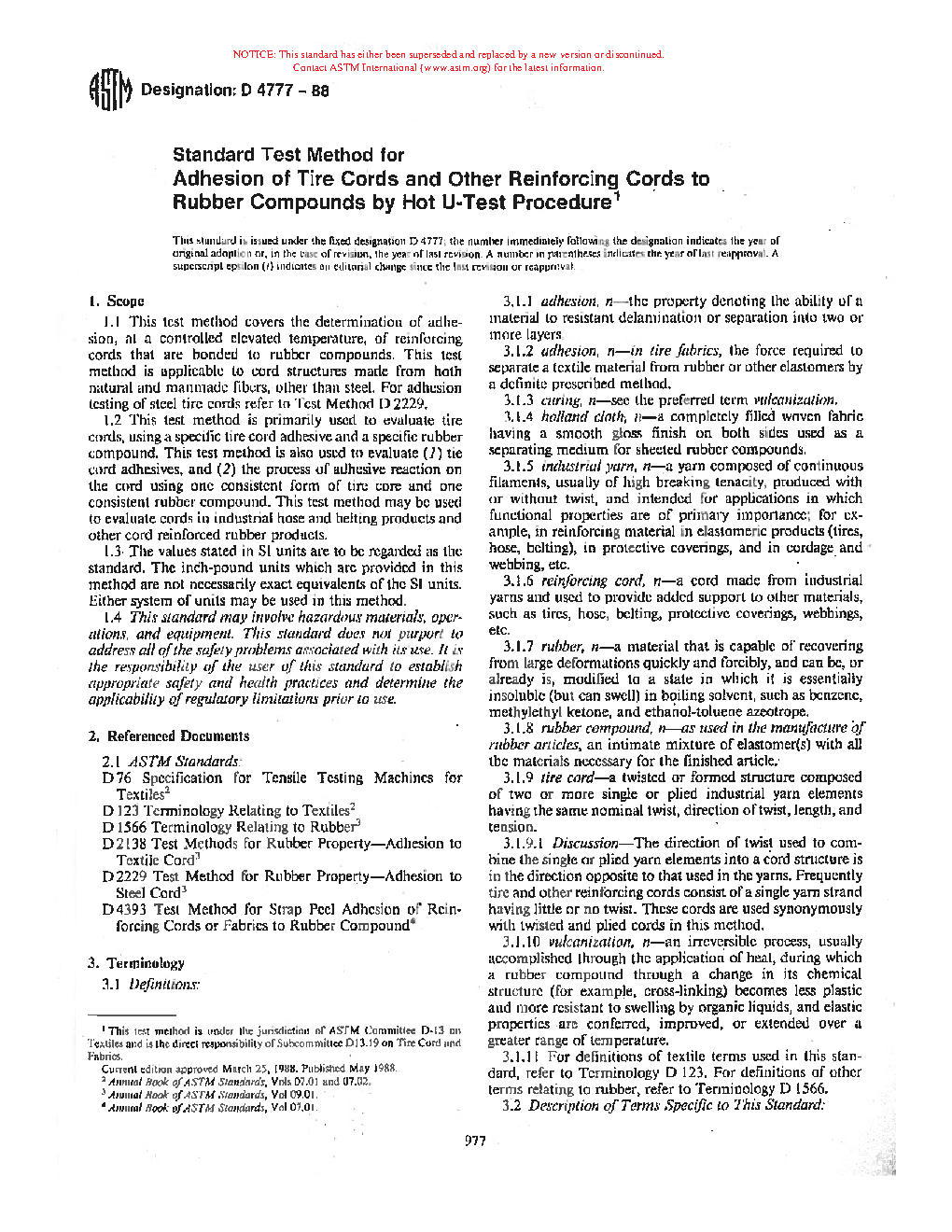 Test Method For Adhesion Of Tire Cords And Other Reinforcing Cords To Rubber Compounds By Hot U-Test Procedure (Withdrawn 1994)