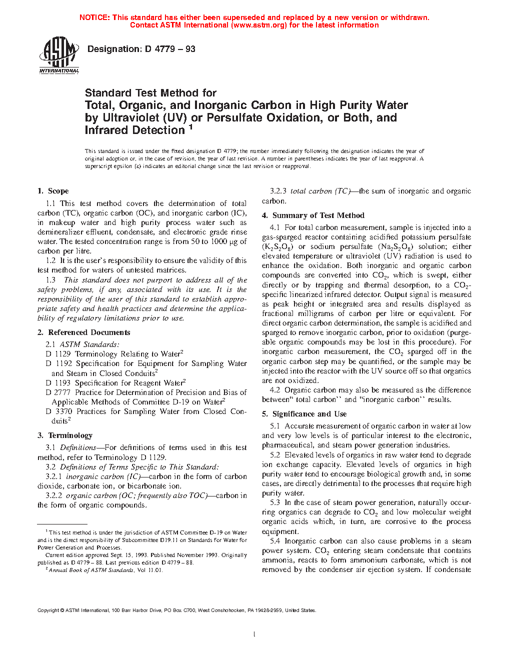 Standard Test Method for Total, Organic, and Inorganic Carbon in High Purity Water by Ultraviolet (UV) or Persulfate Oxidation, or Both, and Infrared Detection (Withdrawn 2002)