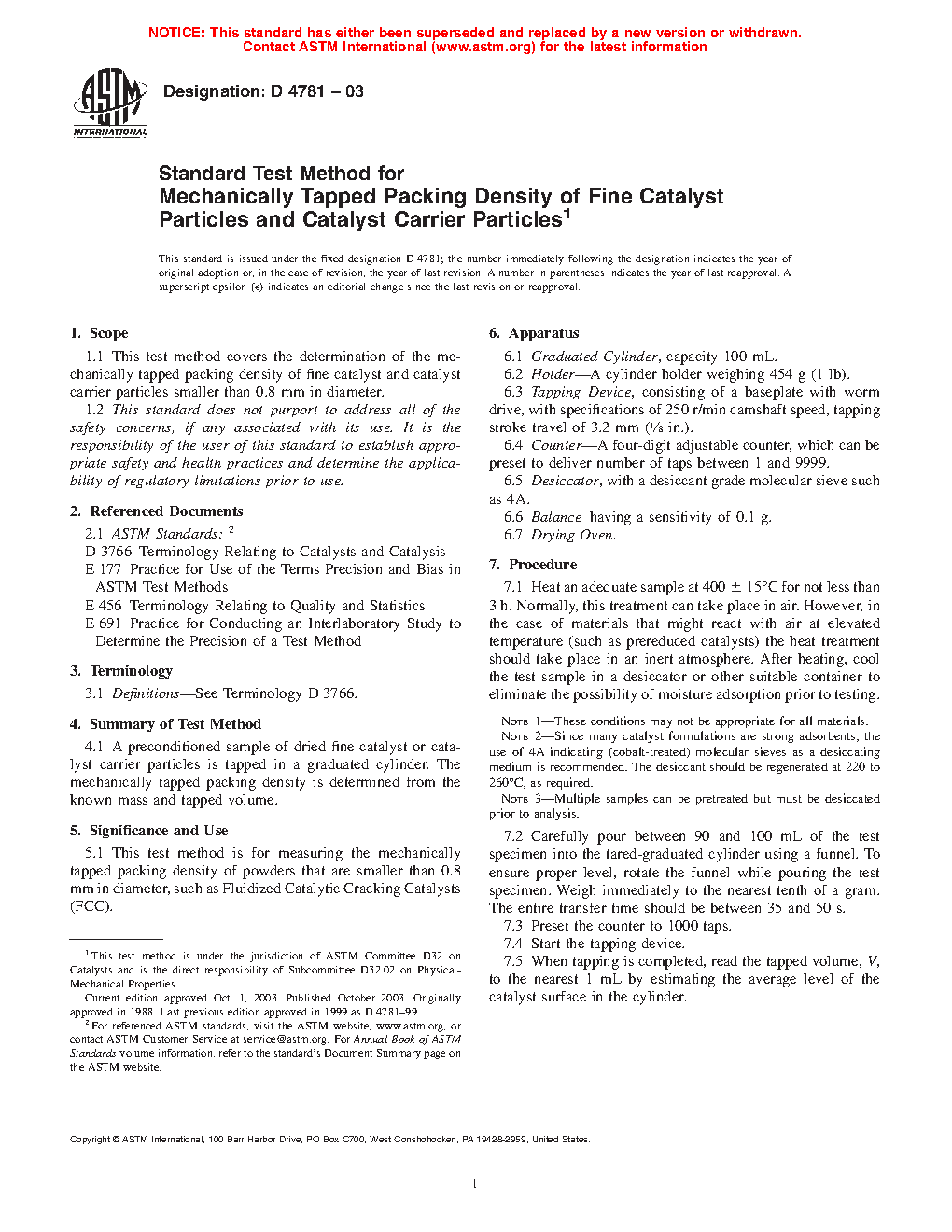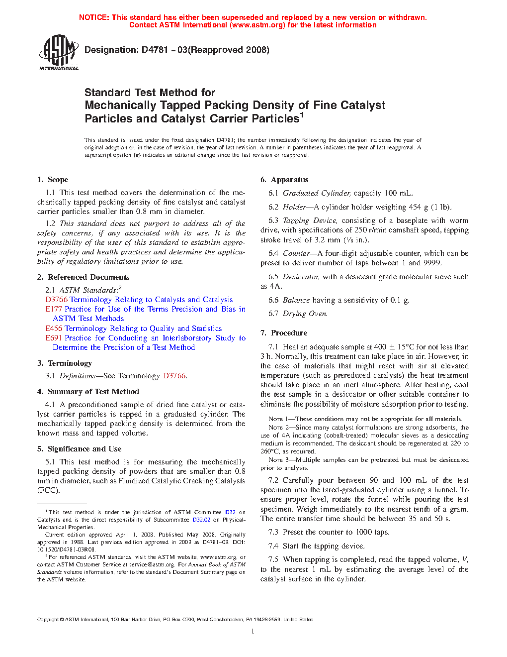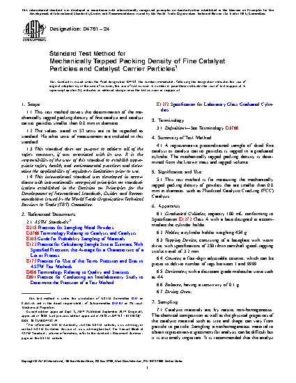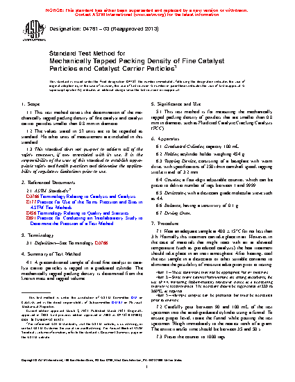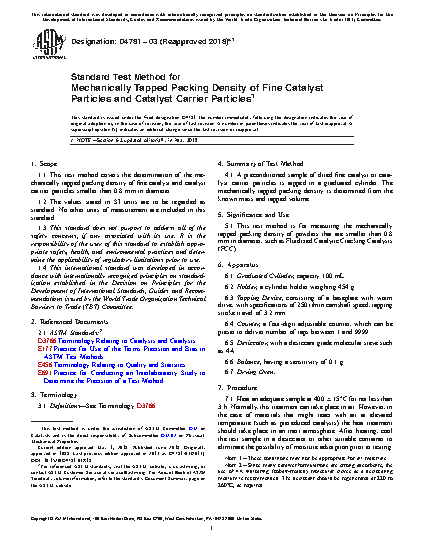 Standard Test Method for Mechanically Tapped Packing Density of Fine Catalyst Particles and Catalyst Carrier Particles