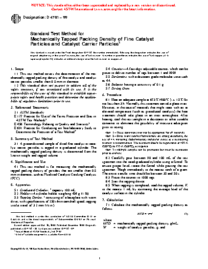 1.1 This test method covers the determination of the mechanically tapped packing density of fine catalyst and catalyst carrier particles smaller than 0.8 mm in diameter.