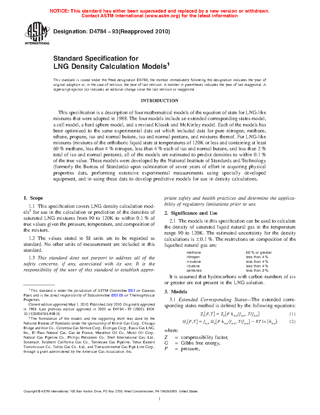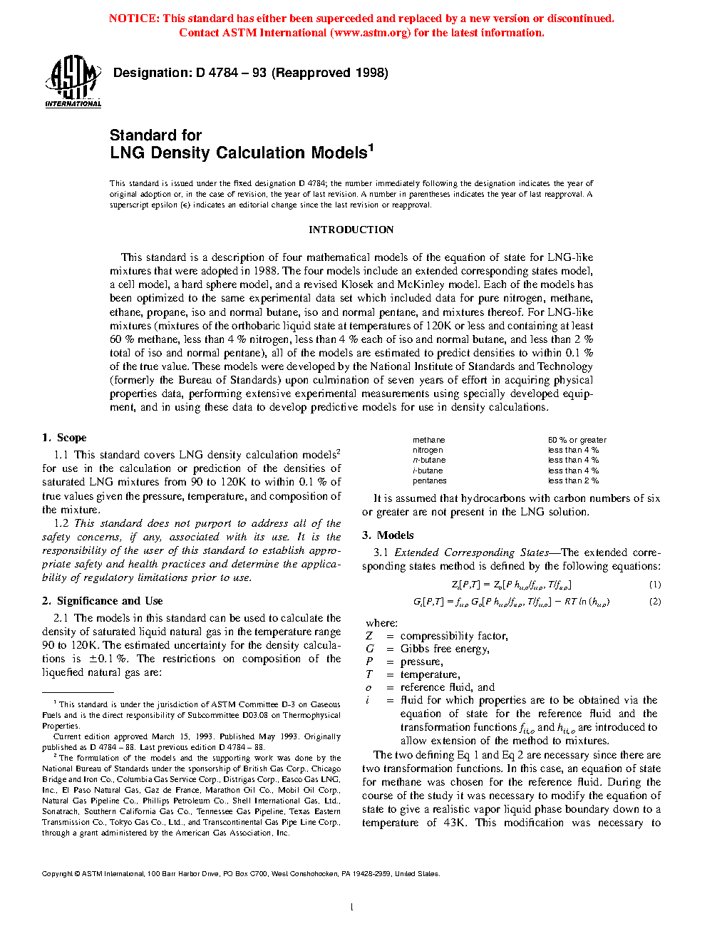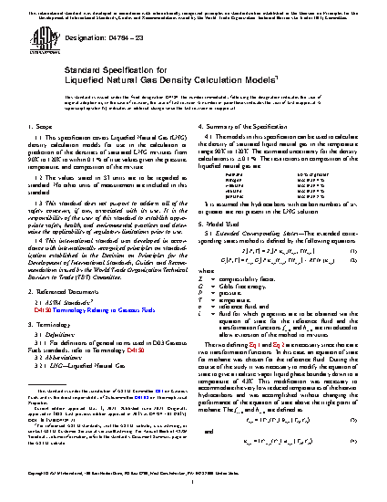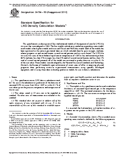 1.1 This standard covers LNG density calculation models for use in the calculation or prediction of the densities of saturated LNG mixtures from 90 to 120K to within 0.1% of true values given the pressure, temperature, and composition of the mixture.