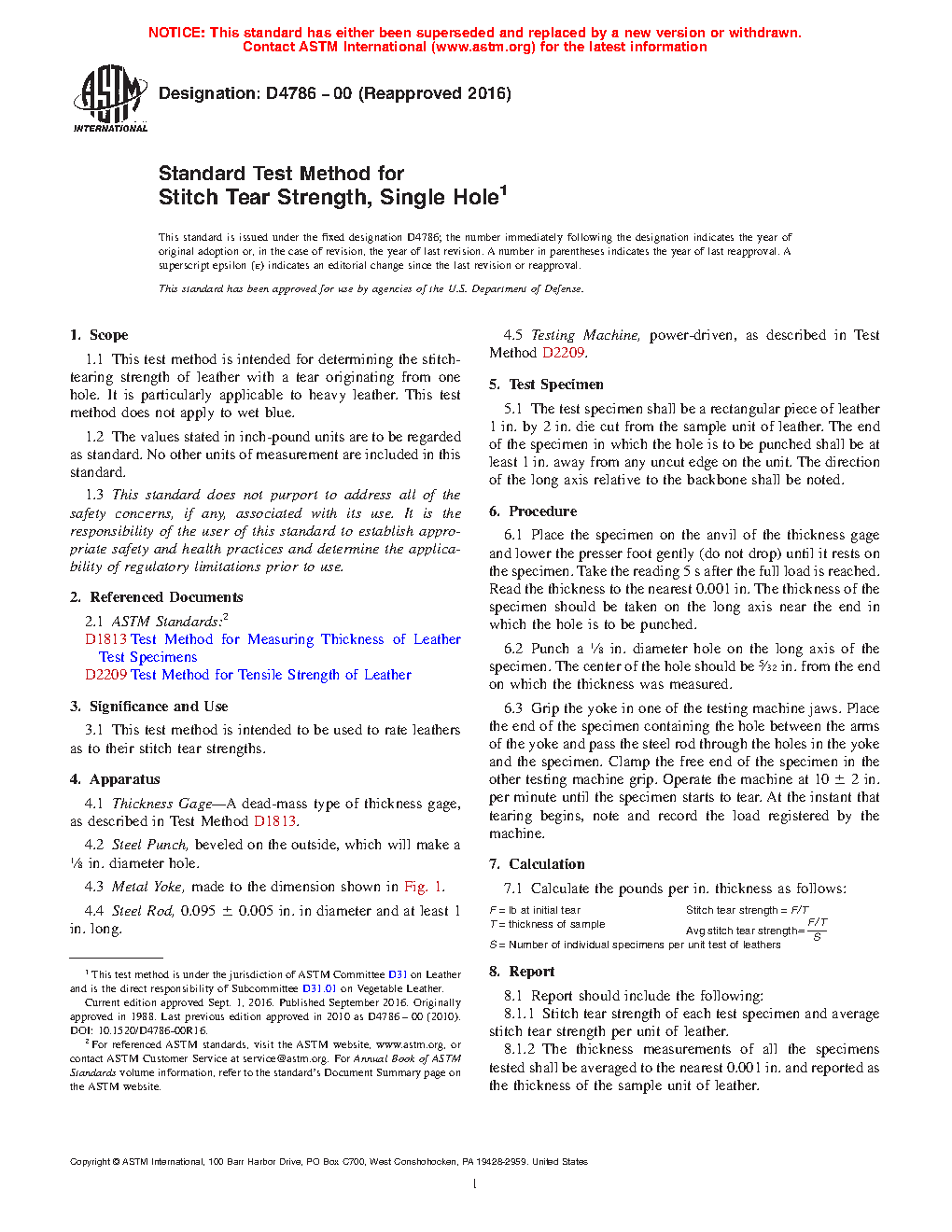 1.1 This test method is intended for determining the stitch-tearing strength of leather with a tear originating from one hole. It is particularly applicable to heavy leather. This test method does not apply to wet blue.