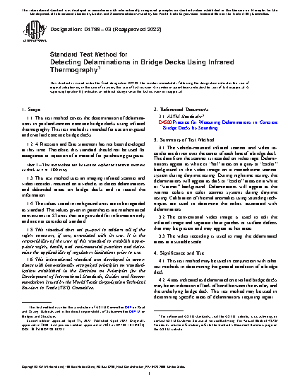 1.1 This test method covers the determination of delaminations in portland-cement concrete bridge decks using infrared thermography. This test method is intended for use on exposed and overlaid concrete bridge decks.