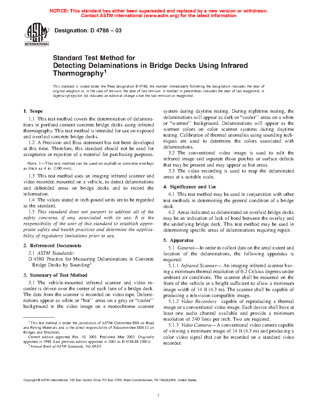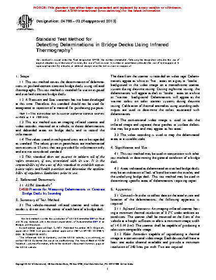 1.1 This test method covers the determination of delaminations in portland-cement concrete bridge decks using infrared thermography. This test method is intended for use on exposed and overlaid concrete bridge decks.