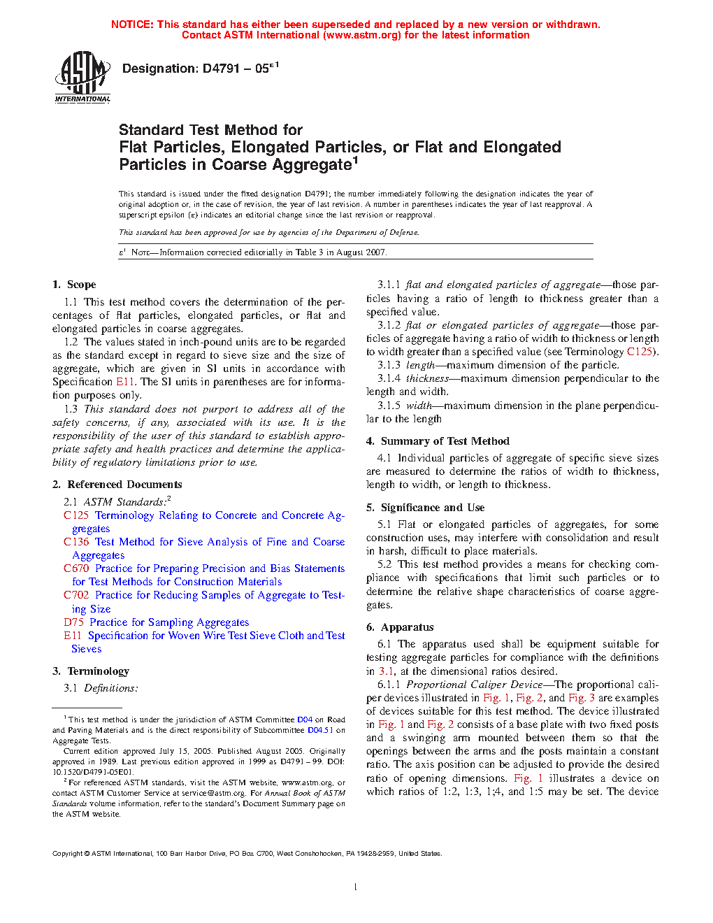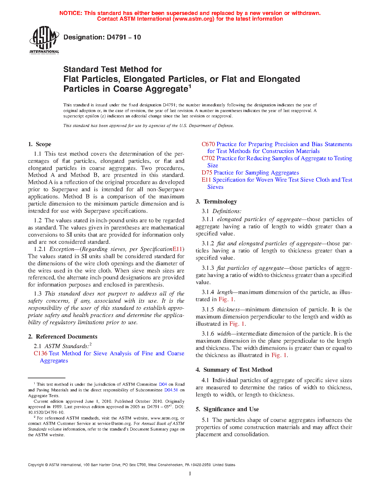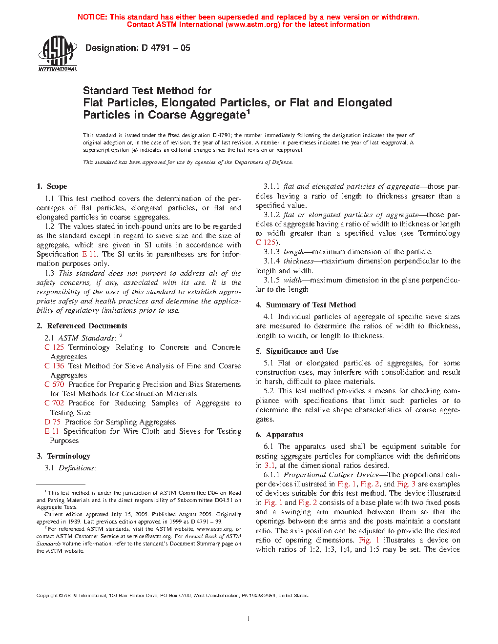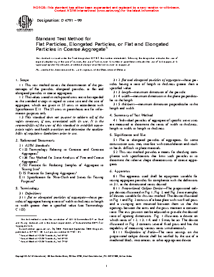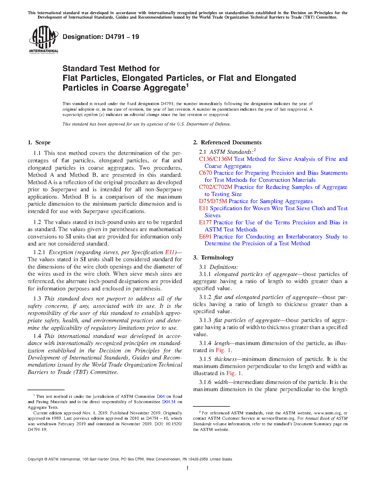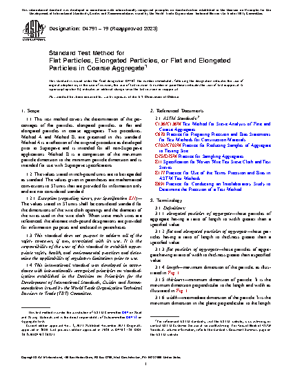1.1 This test method covers the determination of the percentages of flat particles, elongated particles, or flat and elongated particles in coarse aggregates. Two procedures, Method A and Method B, are presented in this standard. Method A is a reflection of the original procedure as developed prior to Superpave and is intended for all non-Superpave applications. Method B is a comparison of the maximum particle dimension to the minimum particle dimension and is intended for use with Superpave specifications.