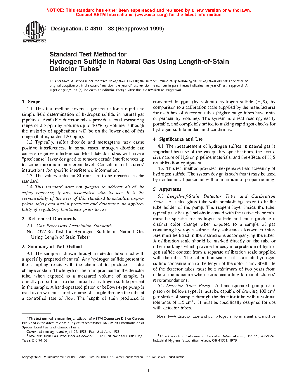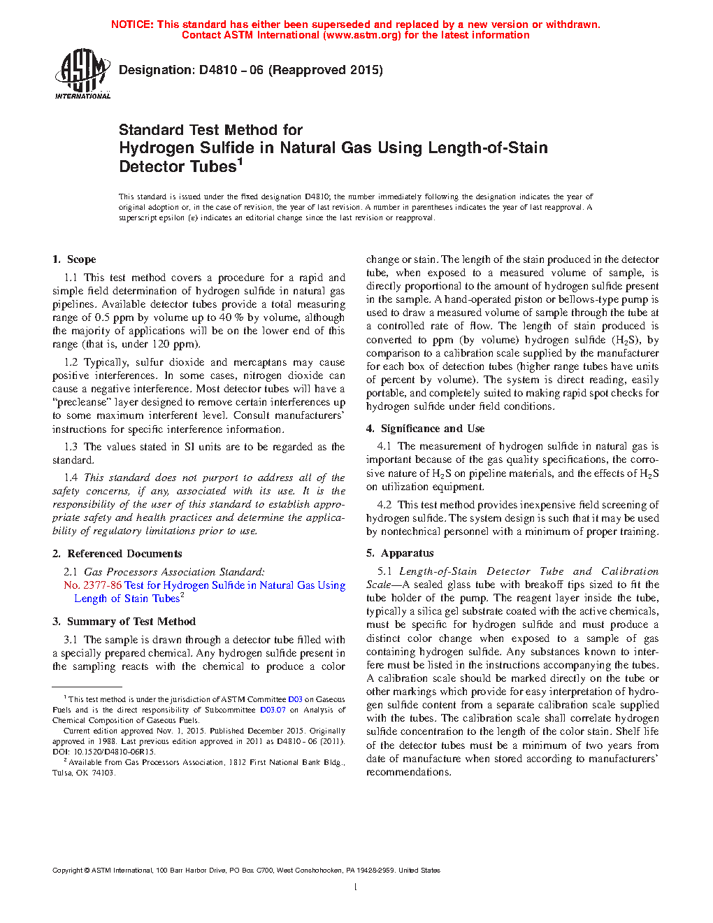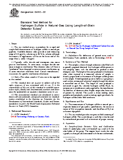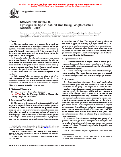 1.1 This test method covers a procedure for a rapid and simple field determination of hydrogen sulfide in natural gas pipelines. Available detector tubes provide a total measuring range of 0.5 ppm by volume up to 40% by volume, although the majority of applications will be on the lower end of this range (that is, under 120 ppm).