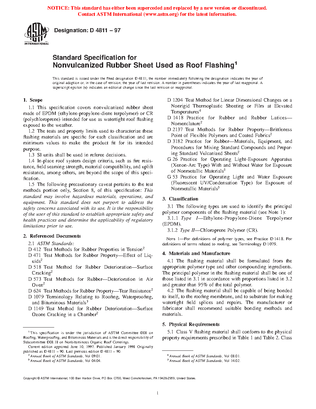 1.1 This specification covers nonvulcanized (uncured) rubber sheet made of EPDM (ethylene-propylene-diene terpolymer) or CR (polychloroprene) intended for use as watertight roof flashing exposed to the weather.