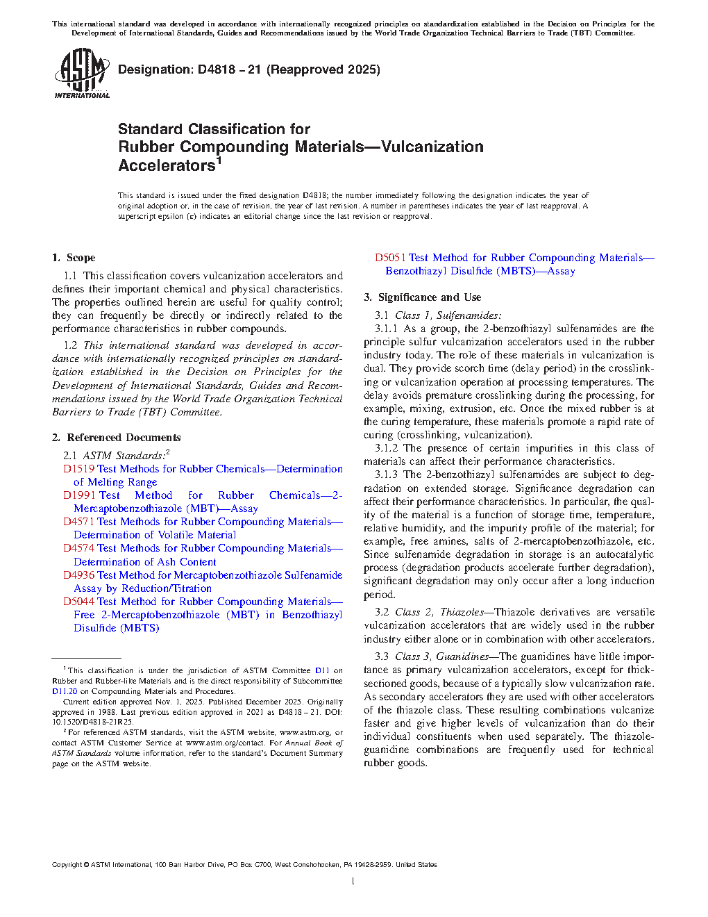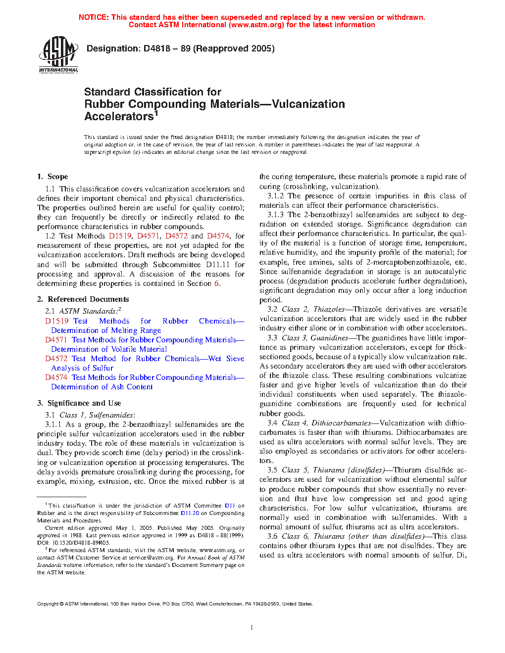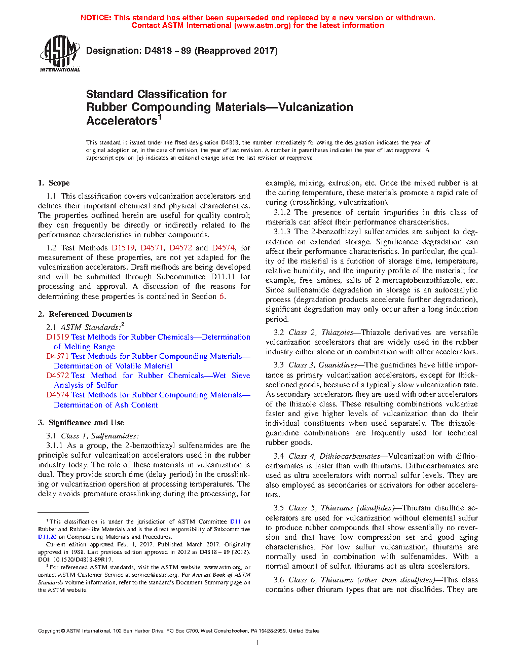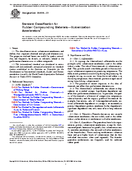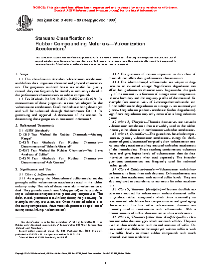 1.1 This classification covers vulcanization accelerators and defines their important chemical and physical characteristics. The properties outlined herein are useful for quality control; they can frequently be directly or indirectly related to the performance characteristics in rubber compounds.