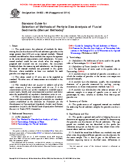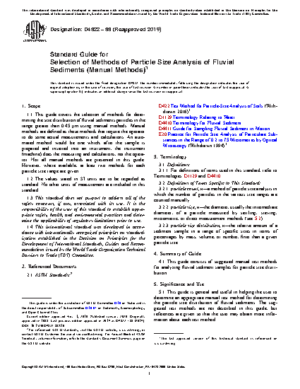1.1 This guide covers the selection of methods for determining the size distribution of fluvial sediments particles in the range greater than 0.45 μm using manual methods. Manual methods are defined as those methods that require the operator to do some actual measurements and calculations. An automated method would be one which, after the sample is prepared and inserted into an instrument, the instrument (machine) does the measuring and calculations, not the operator. Not all manual methods are presented in this guide. However, where available, at least two methods for each particle size range are given.
