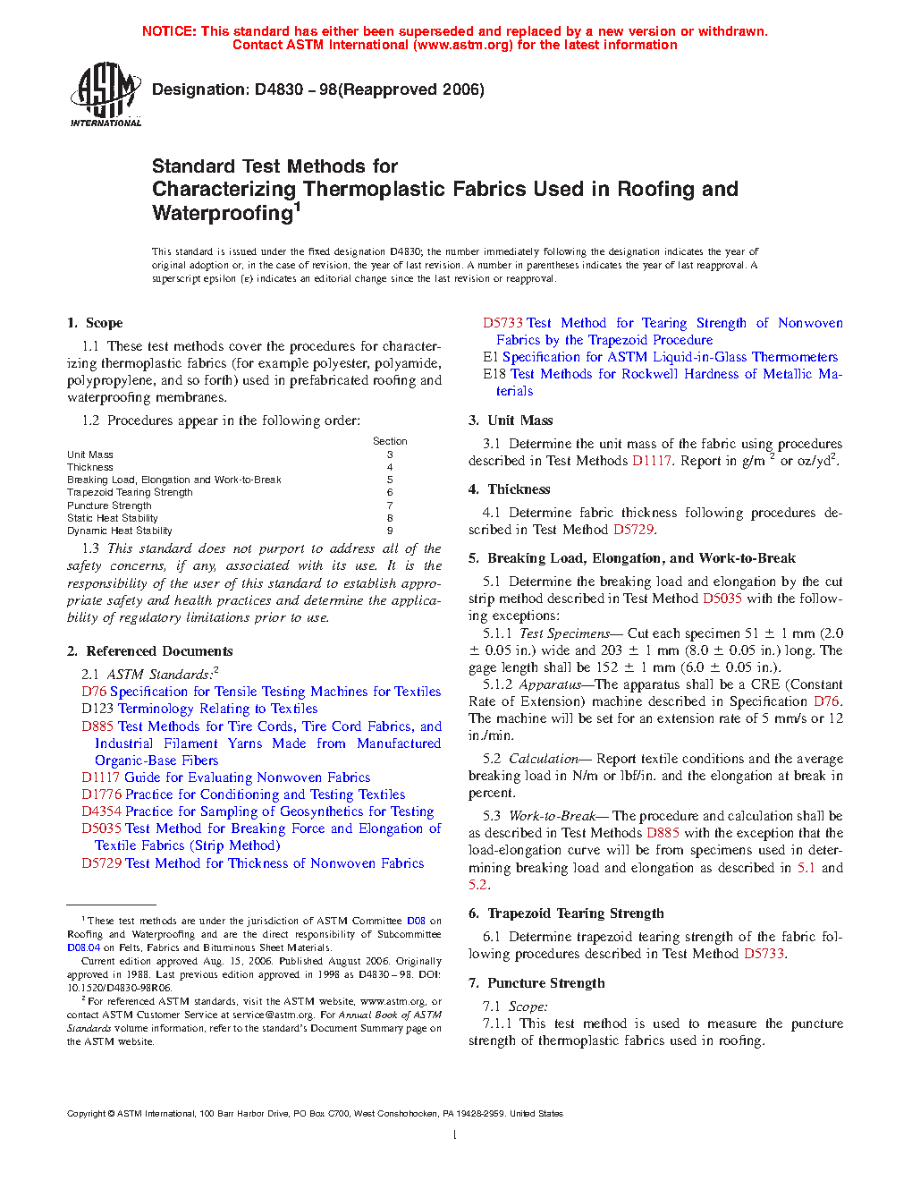 1.1 These test methods cover the procedures for characterizing thermoplastic fabrics (for example polyester, polyamide, polypropylene, and so forth) used in prefabricated roofing and waterproofing membranes.
