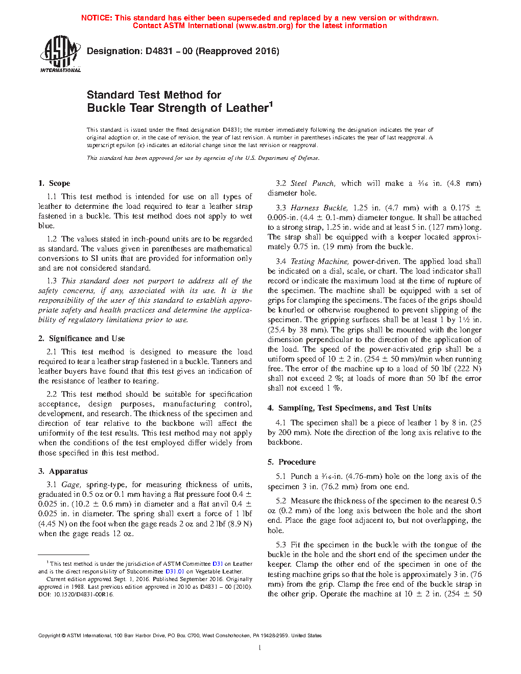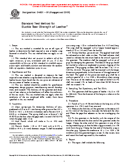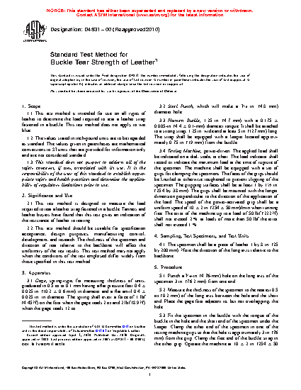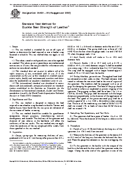 1.1 This test method is intended for use on all types of leather to determine the load required to tear a leather strap fastened in a buckle. This test method does not apply to wet blue.