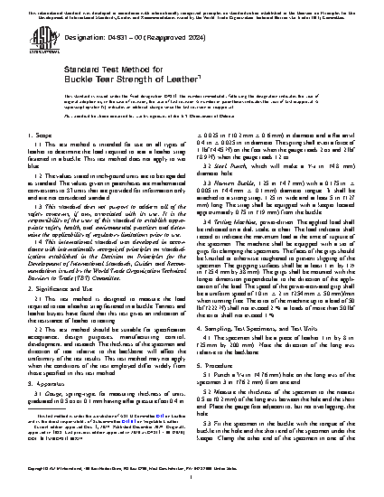 1.1 This test method is intended for use on all types of leather to determine the load required to tear a leather strap fastened in a buckle. This test method does not apply to wet blue.