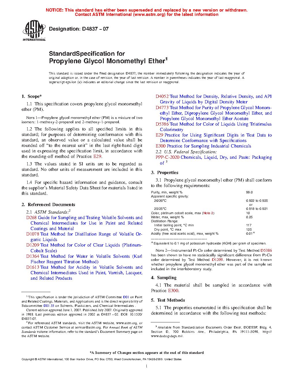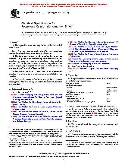 Standard Specification for Propylene Glycol Monomethyl Ether
