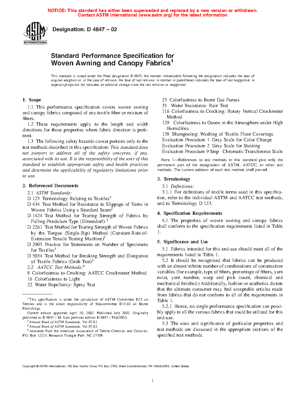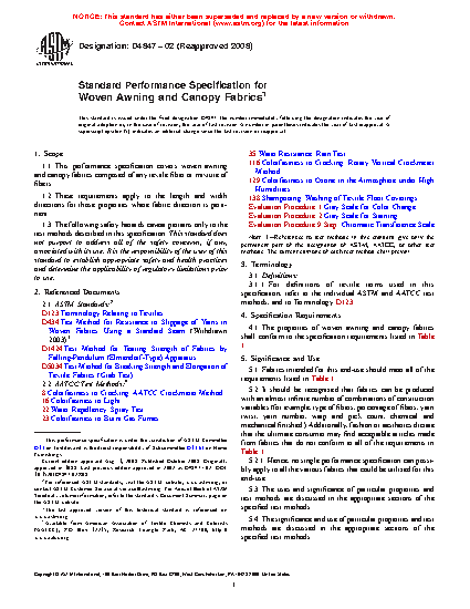 Standard Specification for Woven Awning and Canopy Fabrics