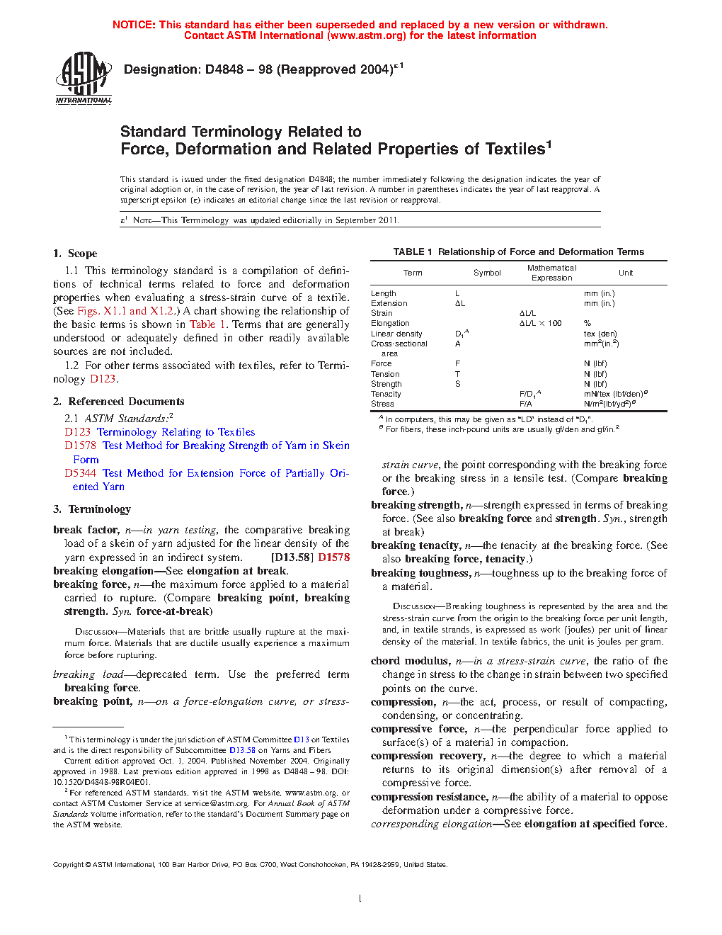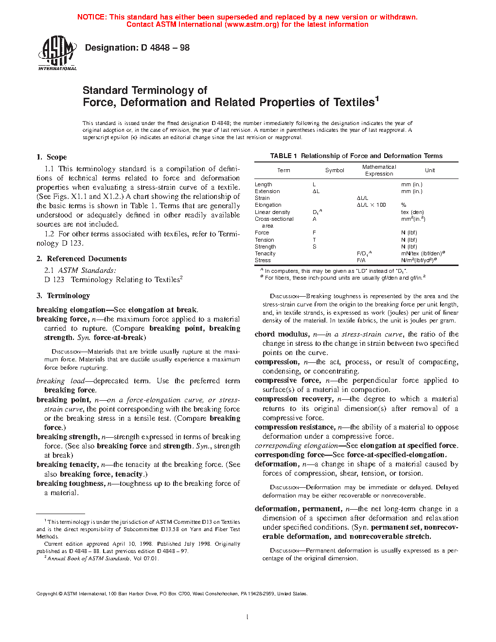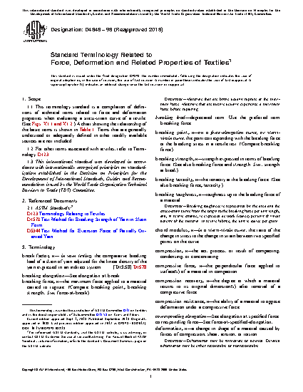 1.1 This terminology standard is a compilation of definitions of technical terms related to force and deformation properties when evaluating a stress-strain curve of a textile. (See Figs. X1.1 and X1.2.) A chart showing the relationship of the basic terms is shown in Table 1. Terms that are generally understood or adequately defined in other readily available sources are not included.