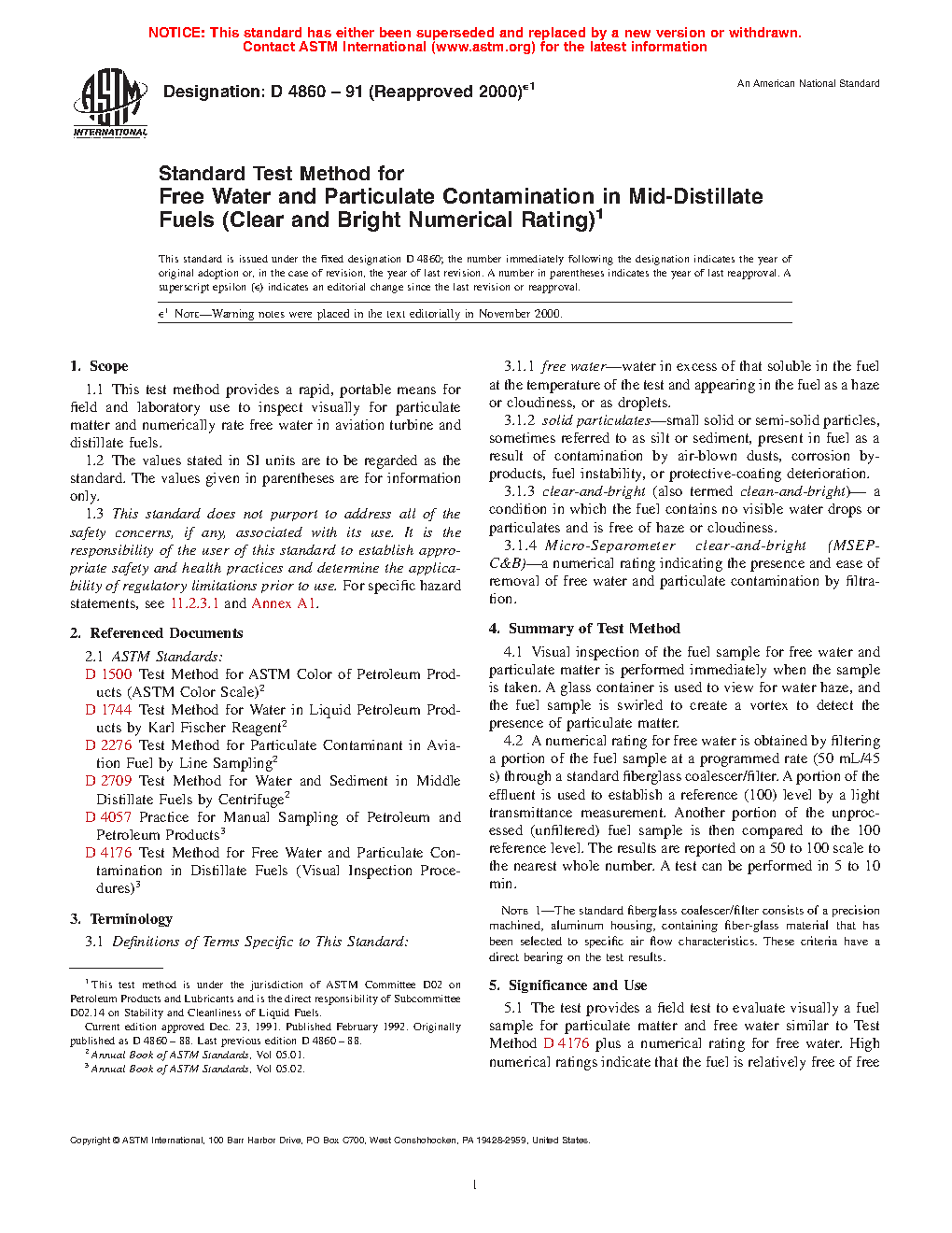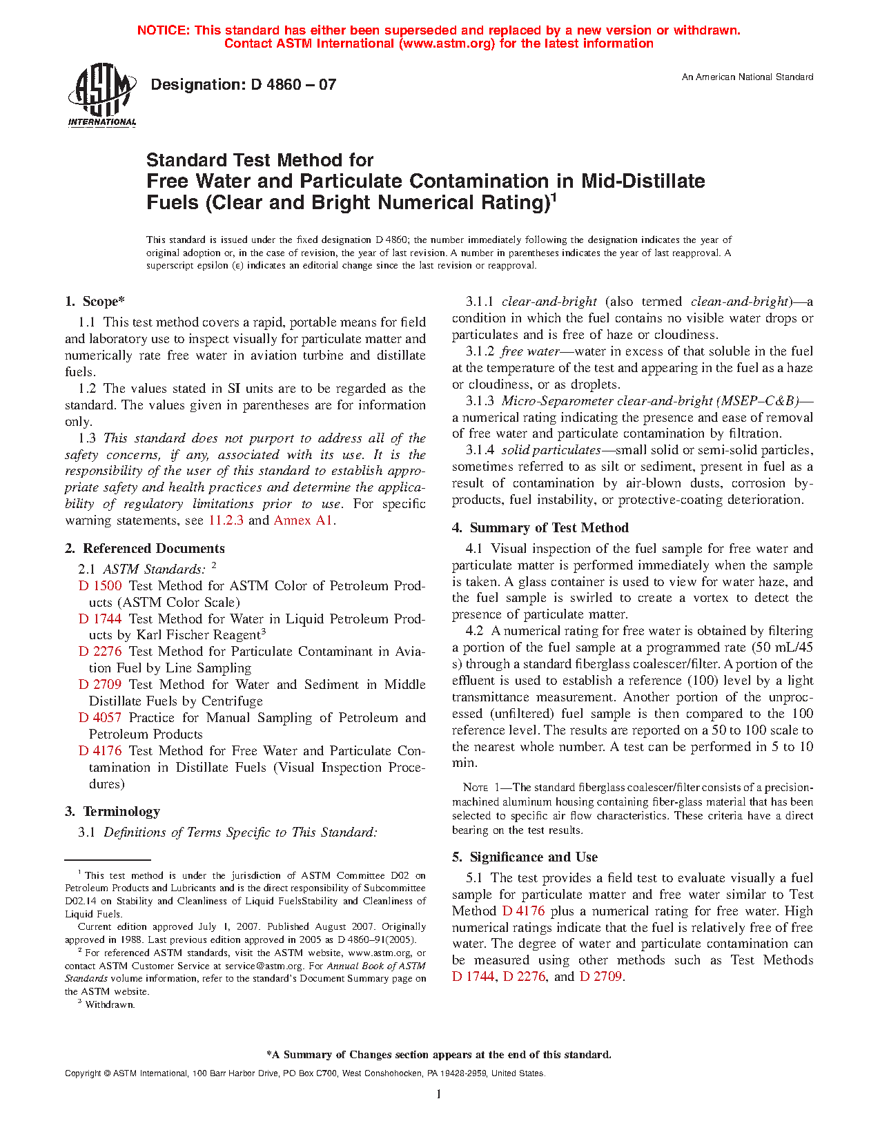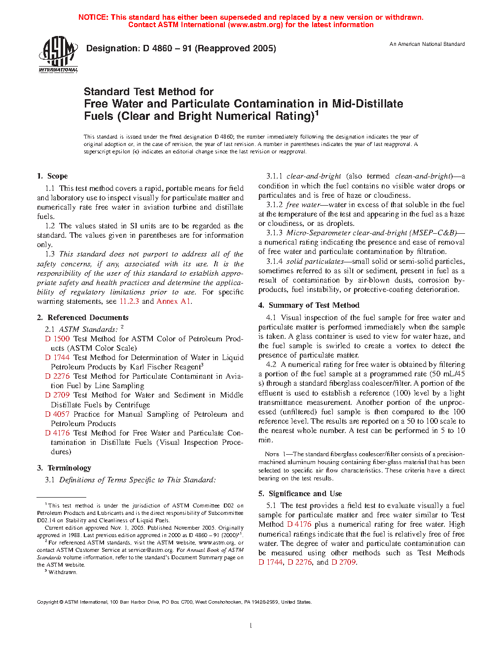 5.1 The test provides a field test to evaluate visually a fuel sample for particulate matter and free water similar to Test Method D4176 plus a numerical rating for free water. High numerical ratings indicate that the fuel is relatively free of free water. The degree of water and particulate contamination can be measured using other methods such as Test Methods D2276, D2709, and D6304.