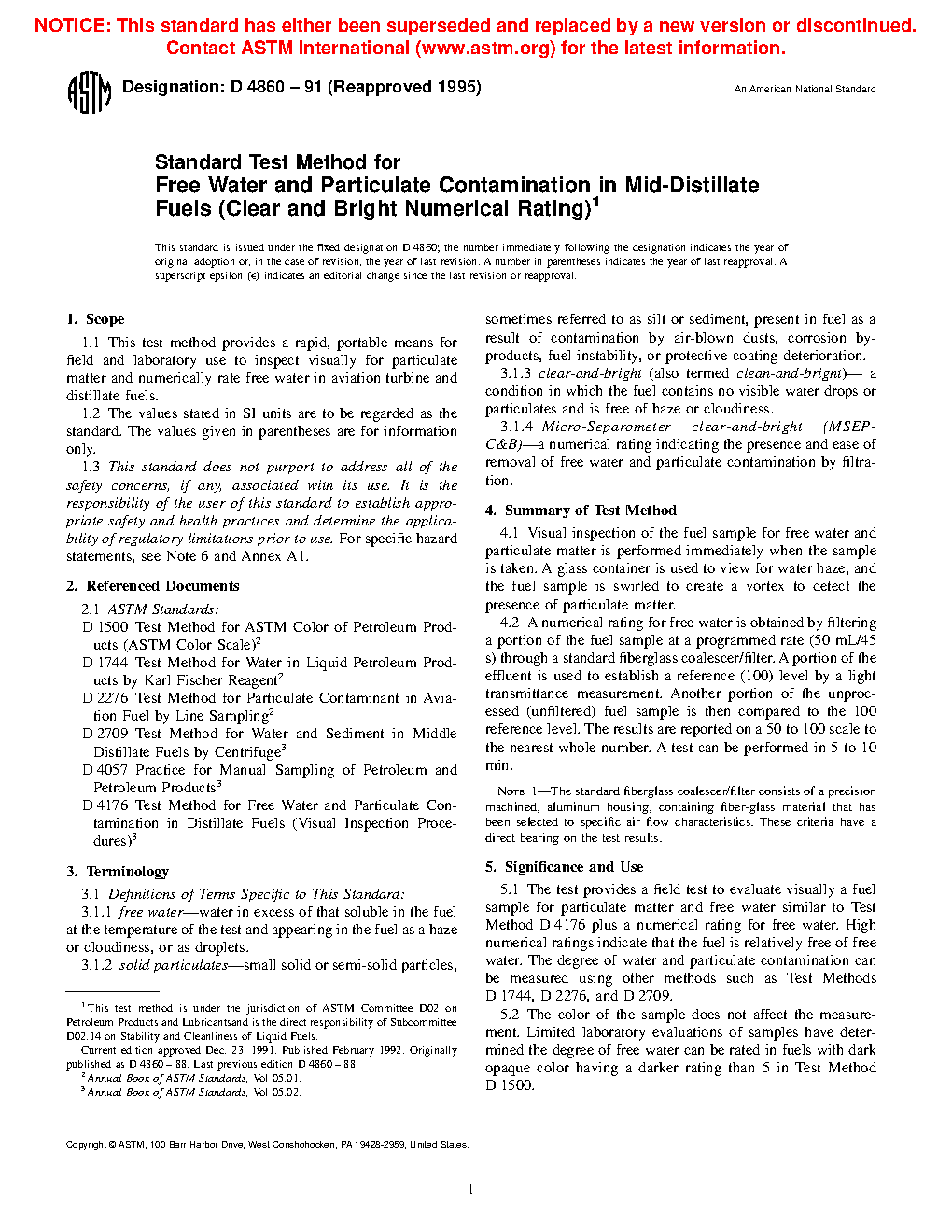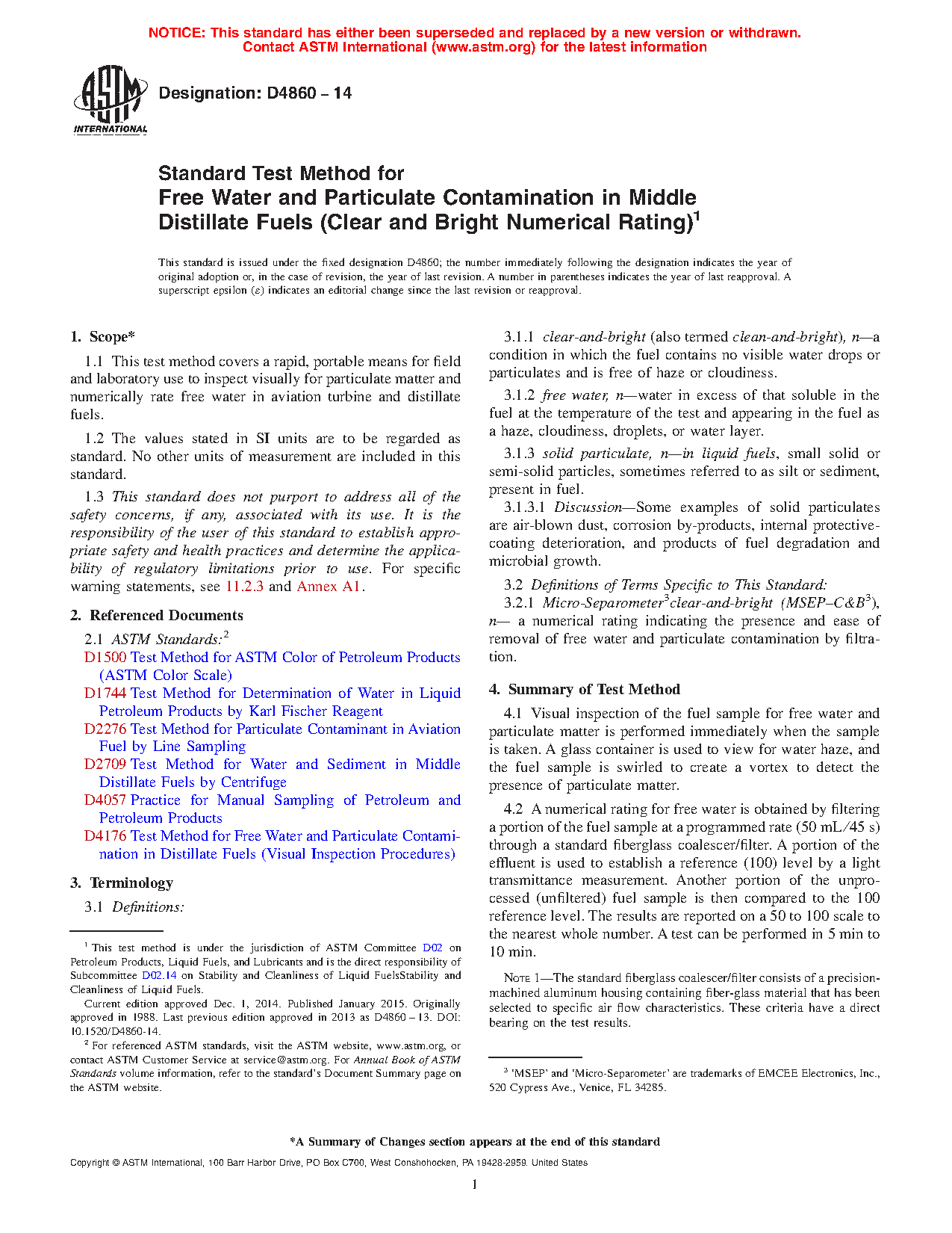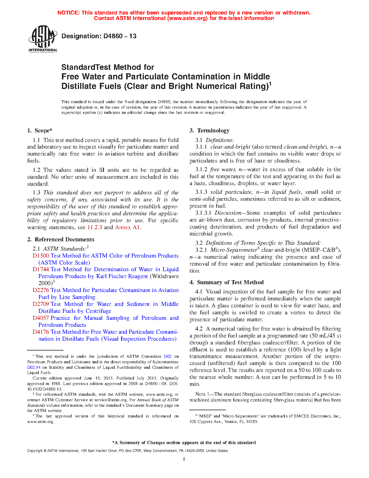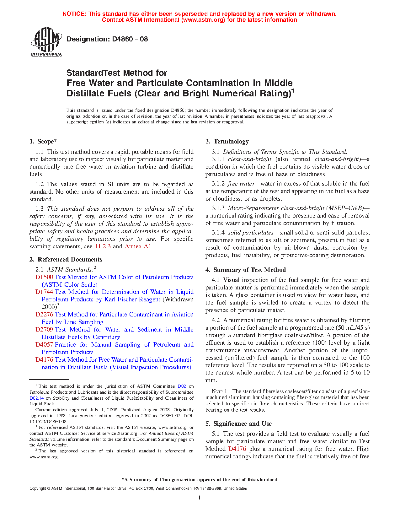 5.1 The test provides a field test to evaluate visually a fuel sample for particulate matter and free water similar to Test Method D4176 plus a numerical rating for free water. High numerical ratings indicate that the fuel is relatively free of free water. The degree of water and particulate contamination can be measured using other methods such as Test Methods D2276, D2709, and D6304.