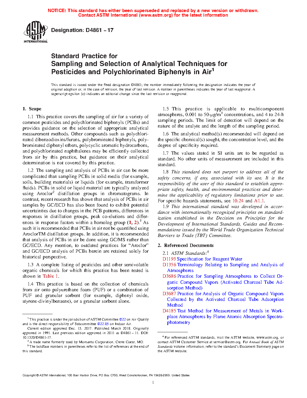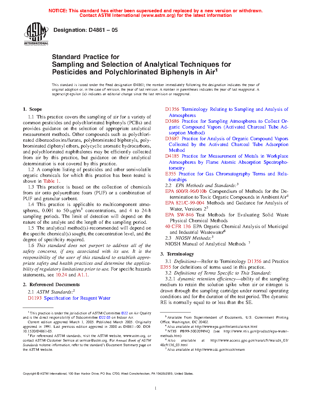 5.2 The methods described in this practice have been successfully applied to measurement of pesticides and PCBs in outdoor air and for personal respiratory exposure monitoring.