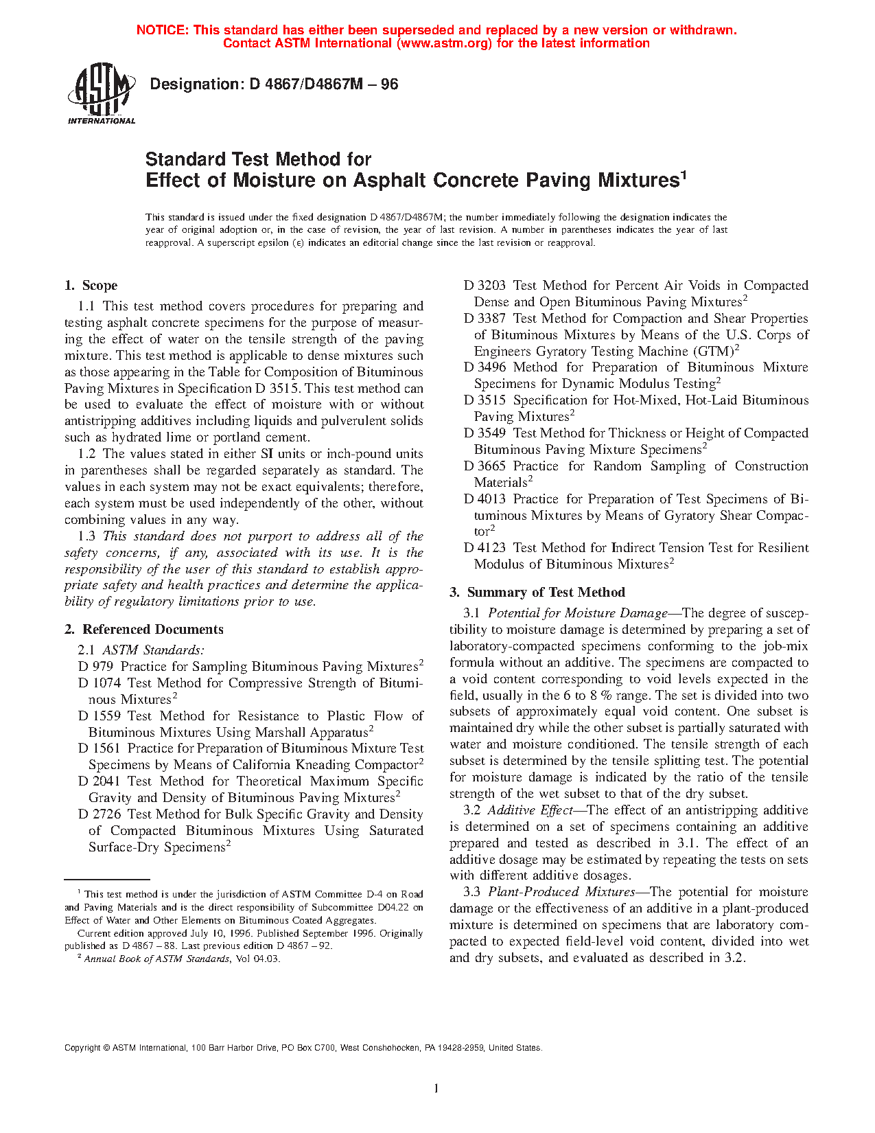 1.1 This test method covers procedures for preparing and testing laboratory-compacted asphalt mixture specimens for the purpose of measuring the effect of water on the tensile strength of the paving mixture. This test method is applicable to dense mixtures such as those appearing in the Table for Composition of Bituminous Paving Mixtures in Specification D3515. This test method can be used to evaluate the effect of moisture with or without antistripping additives including liquids and pulverulent solids such as hydrated lime or portland cement.