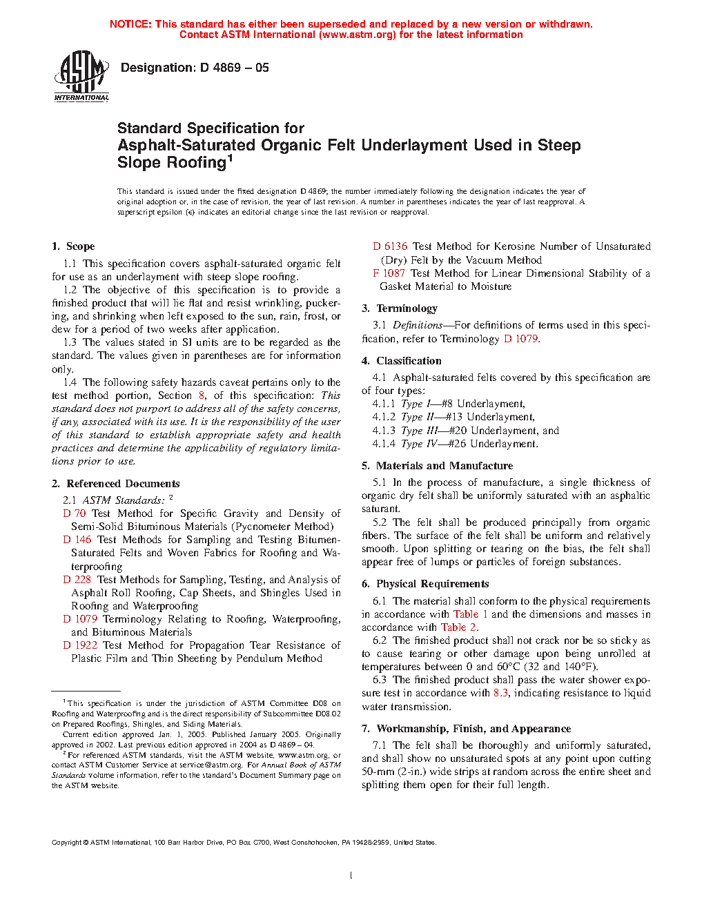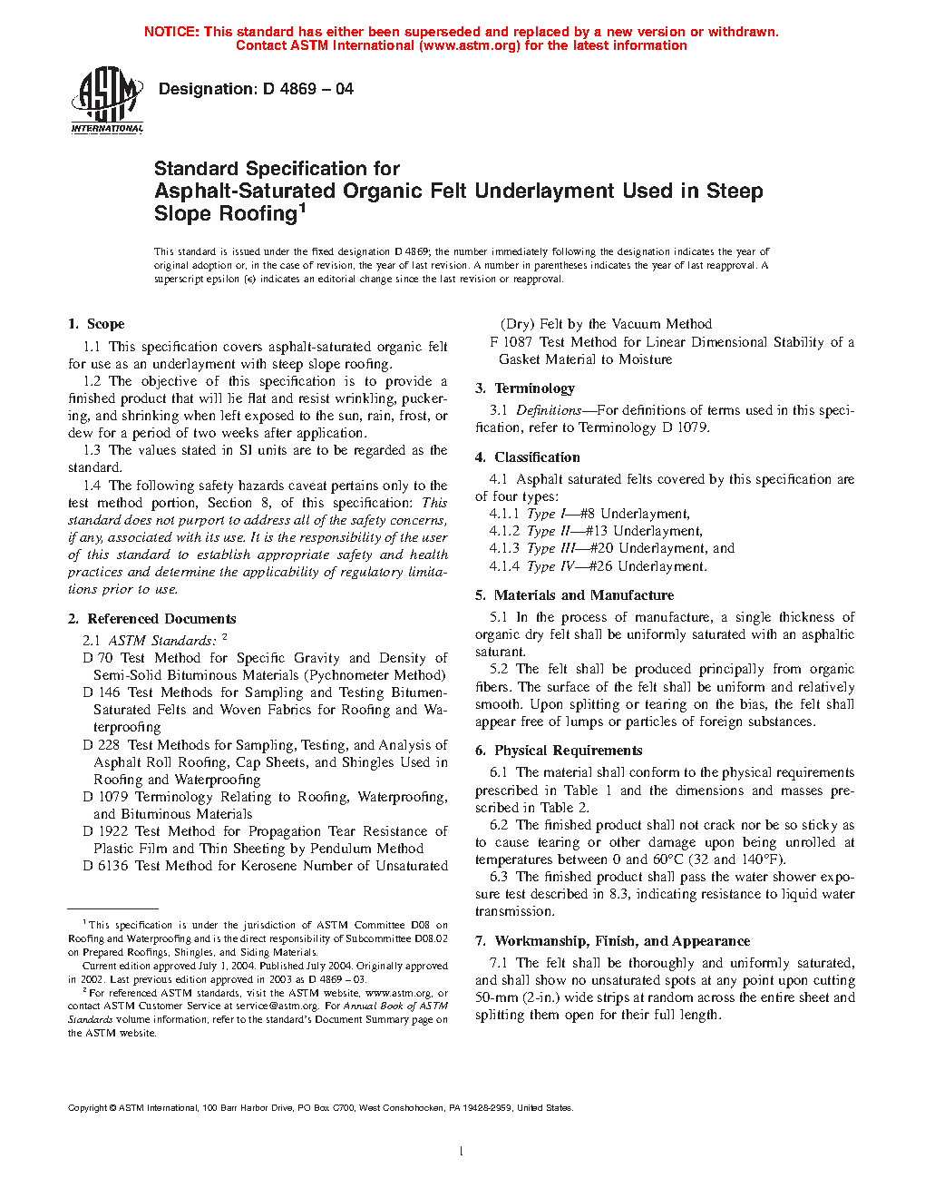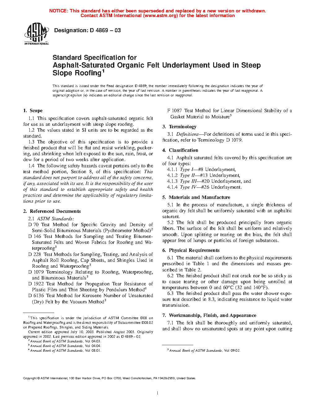 1.1 This specification covers asphalt-saturated organic felt for use as an underlayment with steep slope roofing.