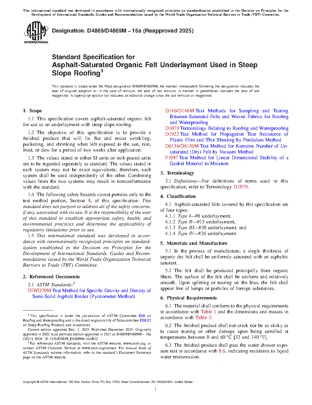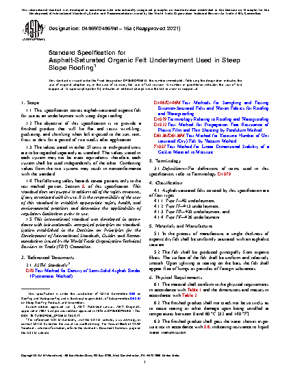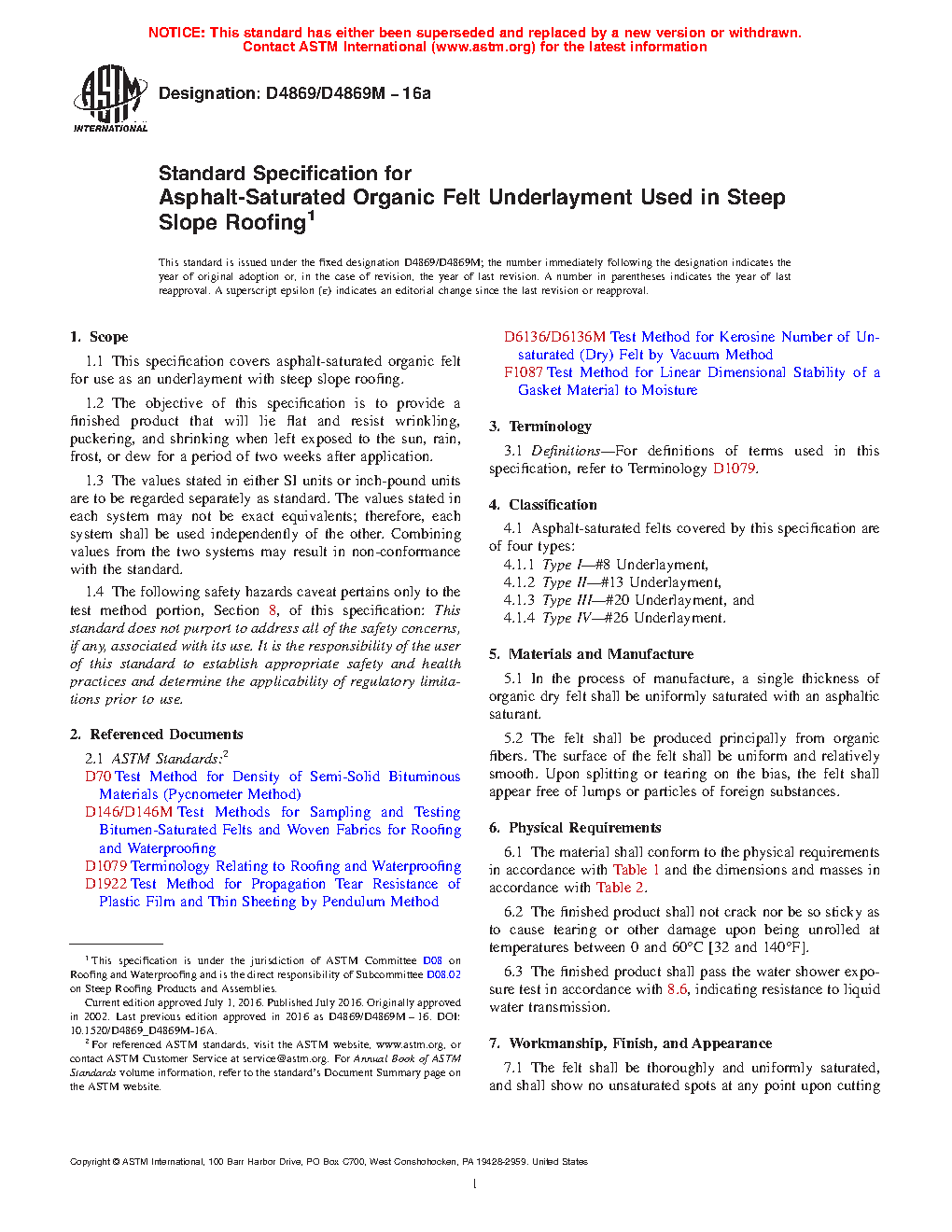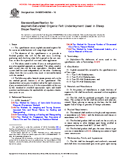 1.1 This specification covers asphalt-saturated organic felt for use as an underlayment with steep slope roofing.