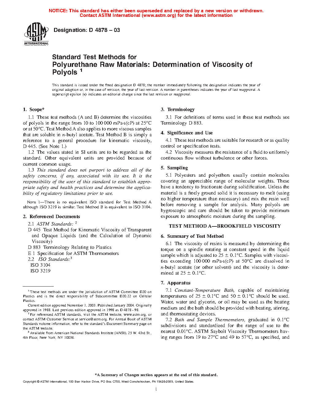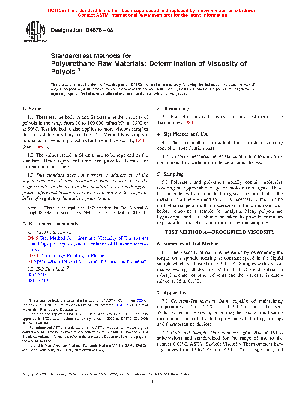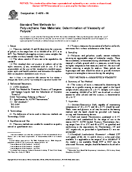 1.1 These test methods (A and B) determine the viscosities of polyols in the range from 10 to 100 000 mPas(cP) at 25°C or at 50°C. Test Method A also applies to more viscous samples that are soluble in n-butyl acetate. Test Method B is simply a reference to a general procedure for kinematic viscosity, D 445. (See Note 1.)