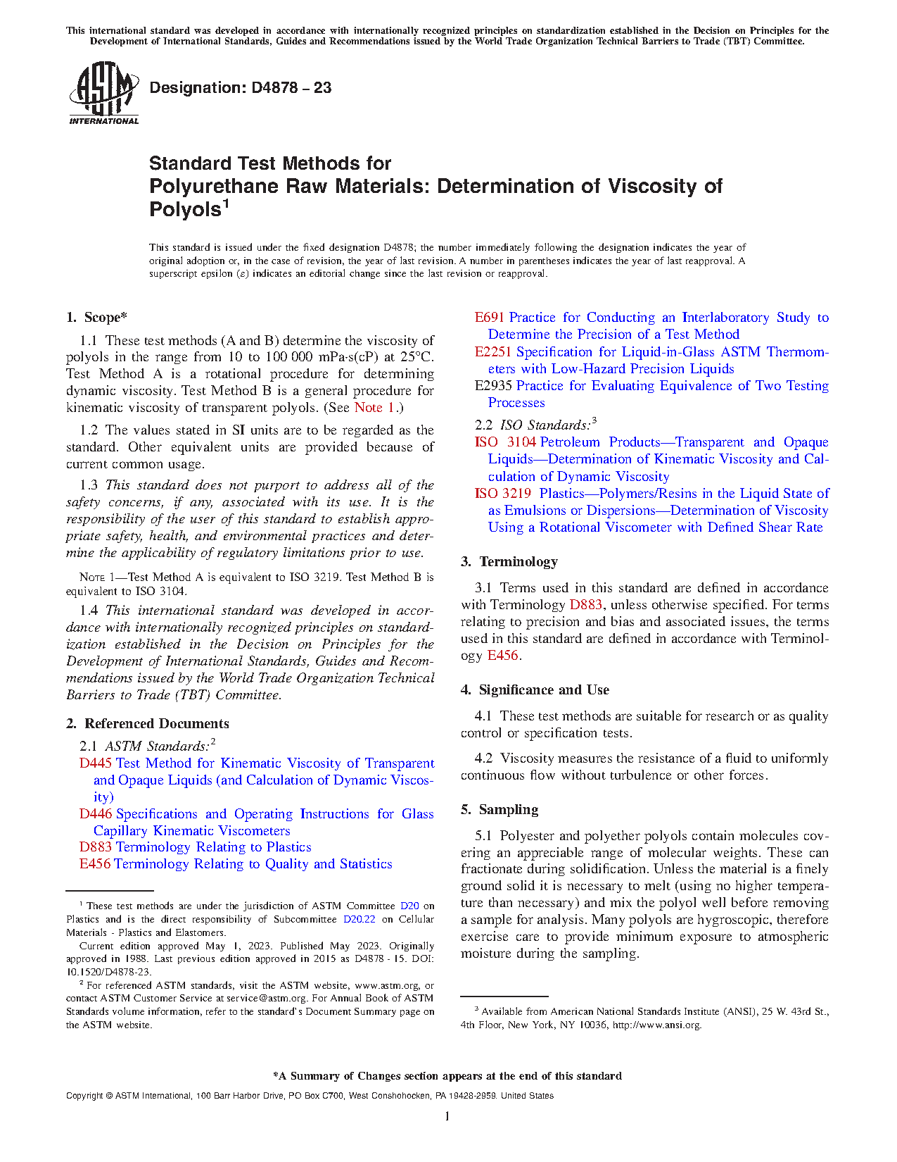 Note 1—There is no equivalent ISO standard for Test Method A although ISO 3219 is similar. Test Method B is equivalent to ISO 3104.