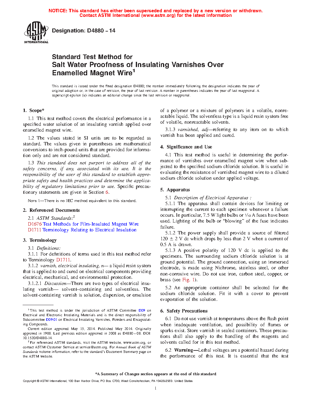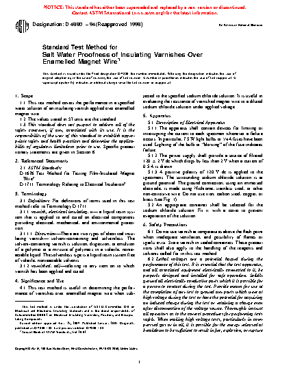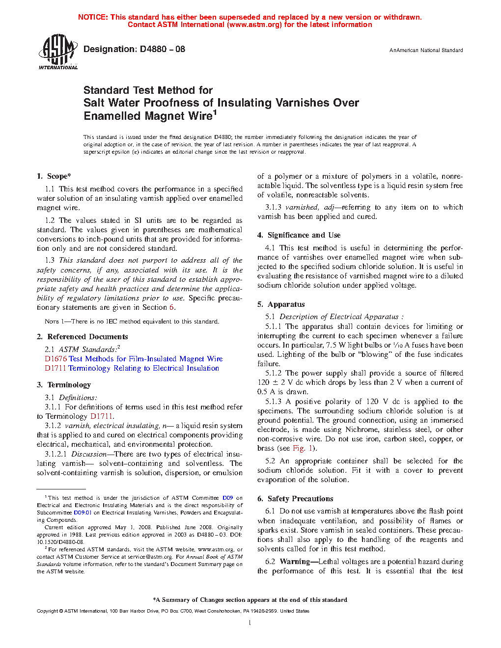 4.1 This test method is useful in determining the performance of varnishes over enamelled magnet wire when subjected to the specified sodium chloride solution. It is useful in evaluating the resistance of varnished magnet wire to a diluted sodium chloride solution under applied voltage.