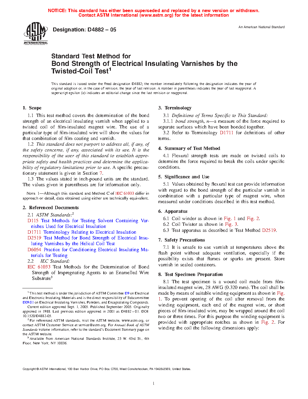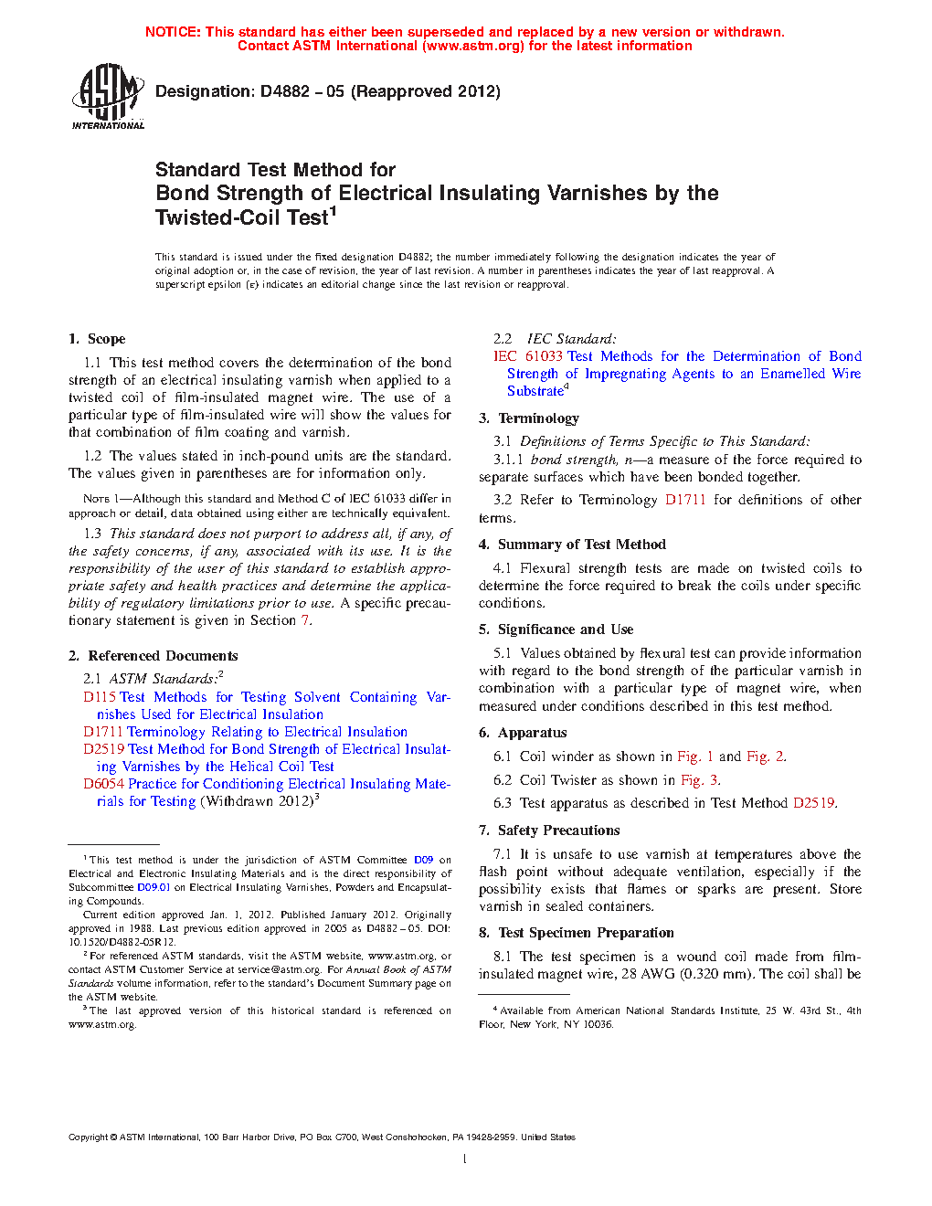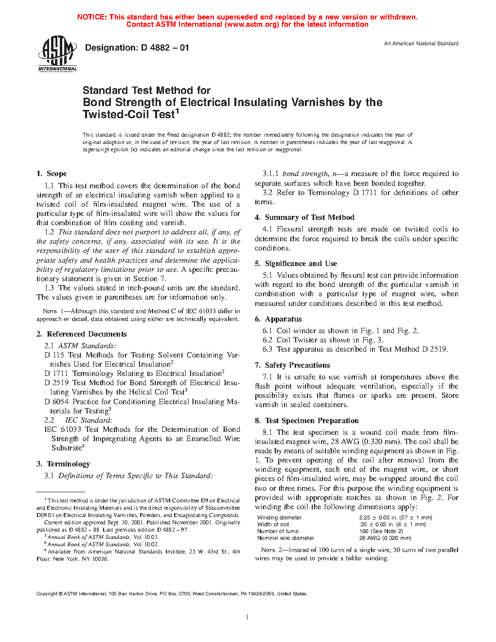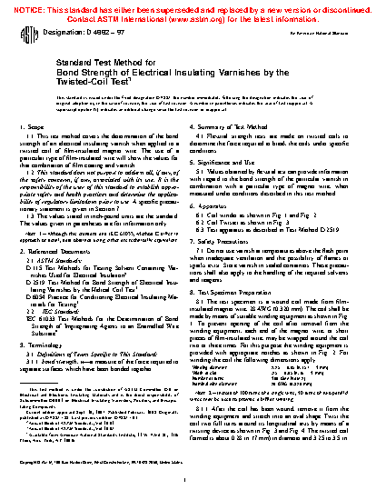 1.1 This test method covers the determination of the bond strength of an electrical insulating varnish when applied to a twisted coil of film-insulated magnet wire. The use of a particular type of film-insulated wire will show the values for that combination of film coating and varnish.