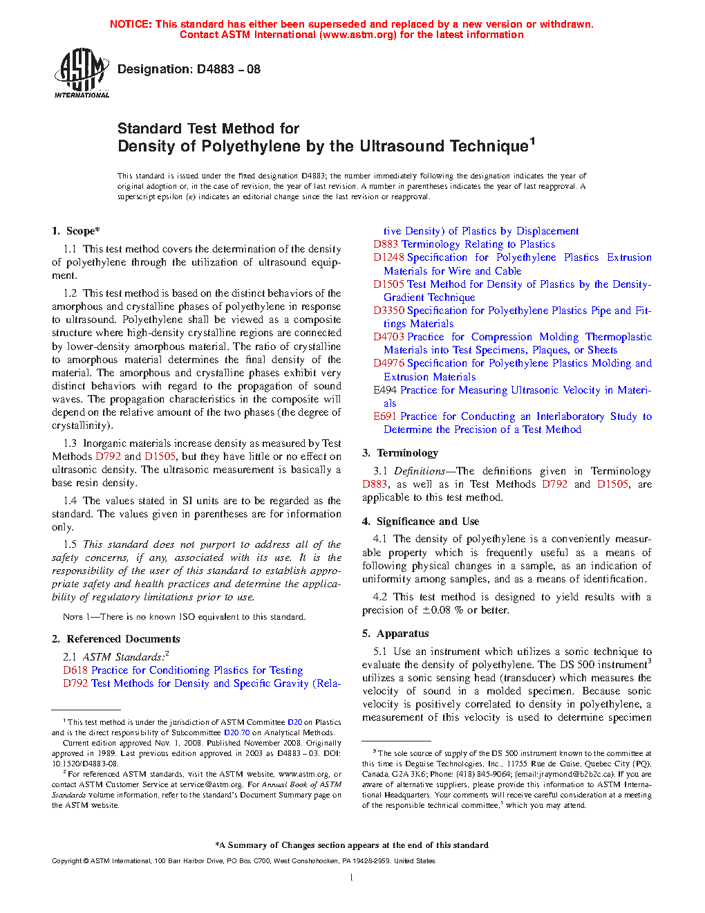 1.2 This test method is based on the distinct behaviors of the amorphous and crystalline phases of polyethylene in response to ultrasound. Polyethylene shall be viewed as a composite structure where high-density crystalline regions are connected by lower-density amorphous material. The ratio of crystalline to amorphous material determines the final density of the material. The amorphous and crystalline phases exhibit very distinct behaviors with regard to the propagation of sound waves. The propagation characteristics in the composite will depend on the relative amount of the two phases (the degree of crystallinity).