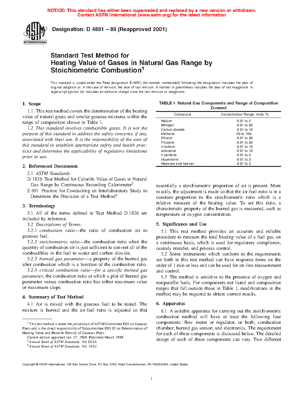 1.1 This test method covers the determination of the heating value of natural gases and similar gaseous mixtures within the range of composition shown in Table 1, and Table 2 that covers flare components but is not intended to limit the components to be measured in flare gases.