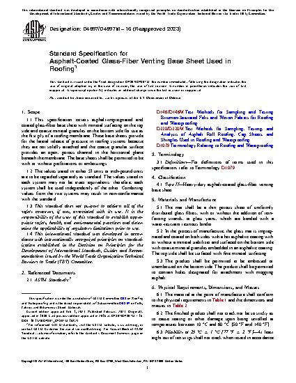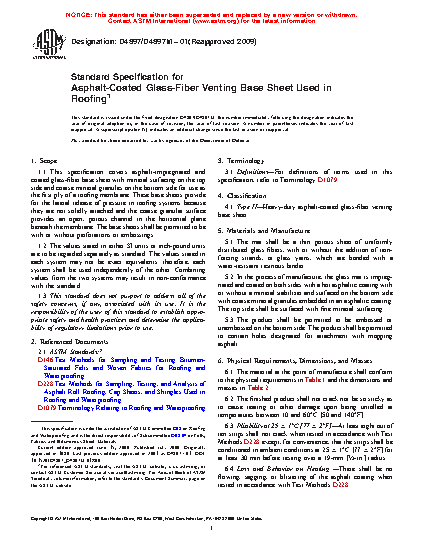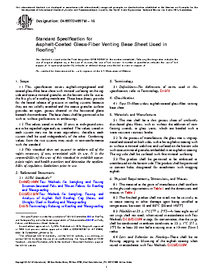 1.1 This specification covers asphalt-impregnated and coated glass-fiber base sheet with mineral surfacing on the top side and coarse mineral granules on the bottom side for use as the first ply of a roofing membrane. These base sheets provide for the lateral release of pressure in roofing systems because they are not solidly attached and the coarse granular surface provides an open, porous channel in the horizontal plane beneath the membrane. The base sheets shall be permitted to be with or without perforations or embossings.