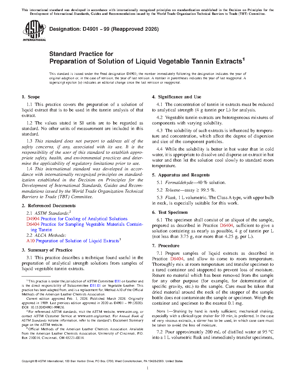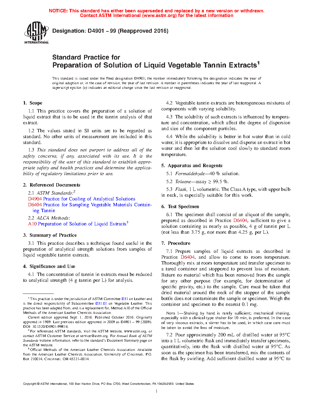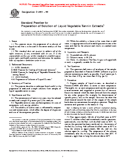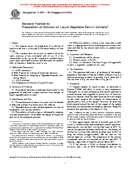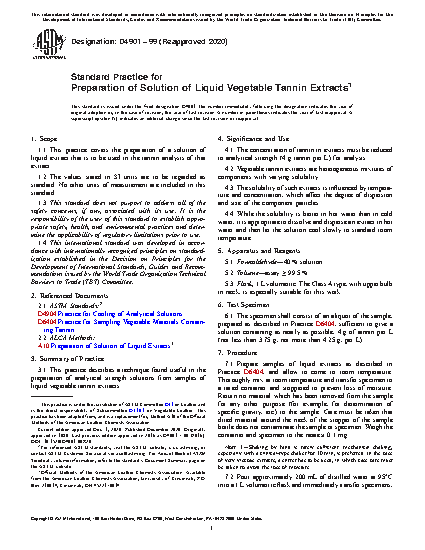 1.1 This practice covers the preparation of a solution of liquid extract that is to be used in the tannin analysis of that extract.