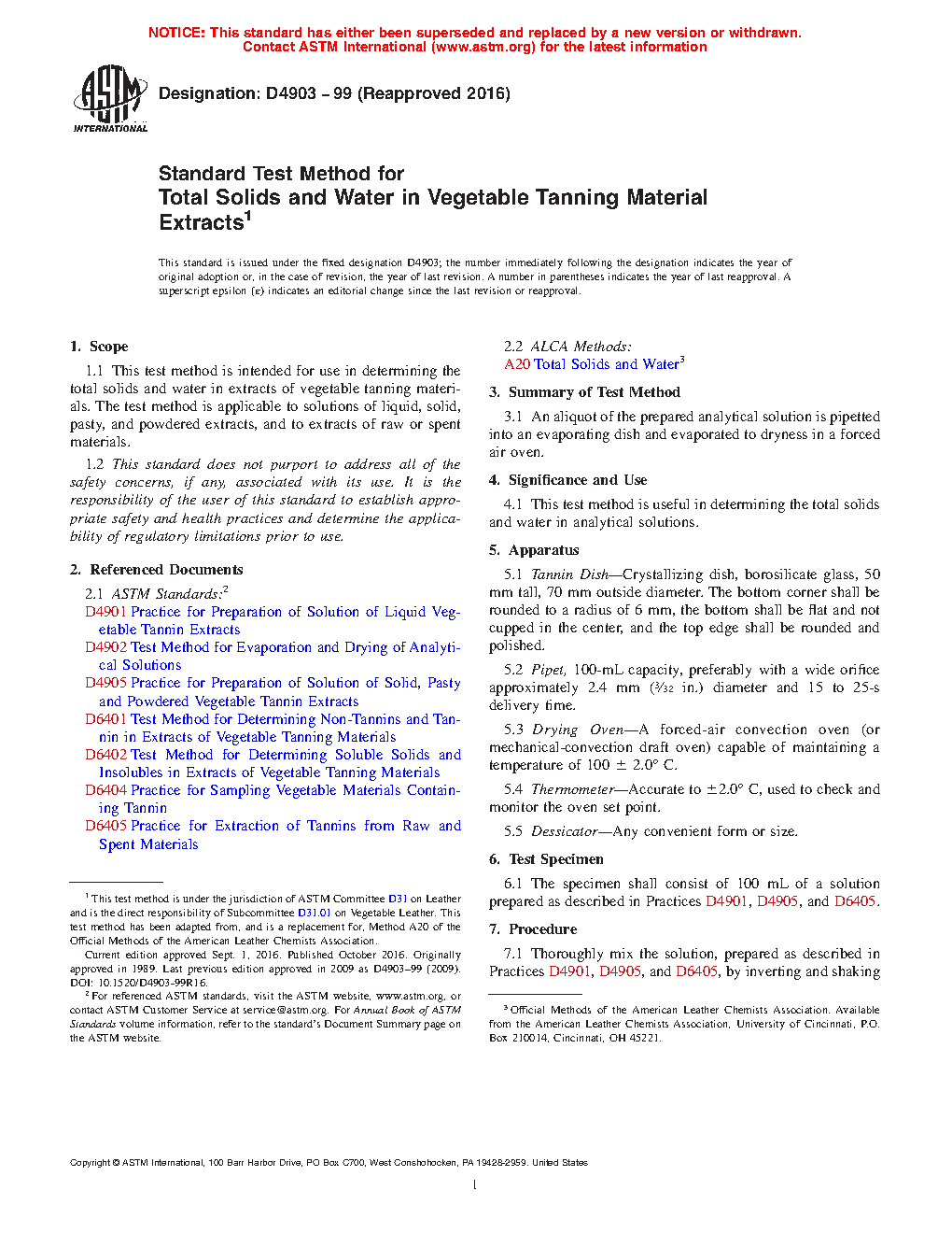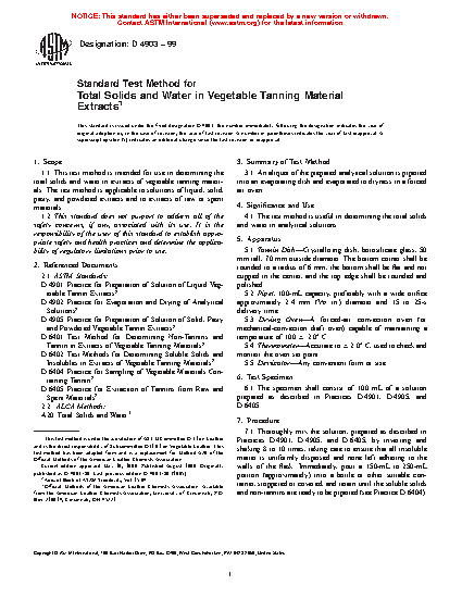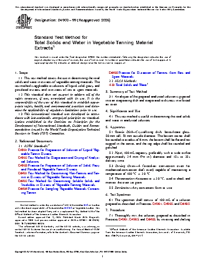 1.1 This test method is intended for use in determining the total solids and water in extracts of vegetable tanning materials. The test method is applicable to solutions of liquid, solid, pasty, and powdered extracts, and to extracts of raw or spent materials.