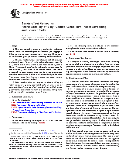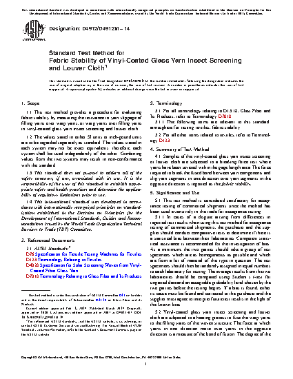 1.1 This test method provides a procedure for evaluating fabric stability by measuring the resistance to yarn slippage of filling yarns over warp yarns, or warp yarns over filling yarns in vinyl-coated glass yarn insect screening and louver cloth.