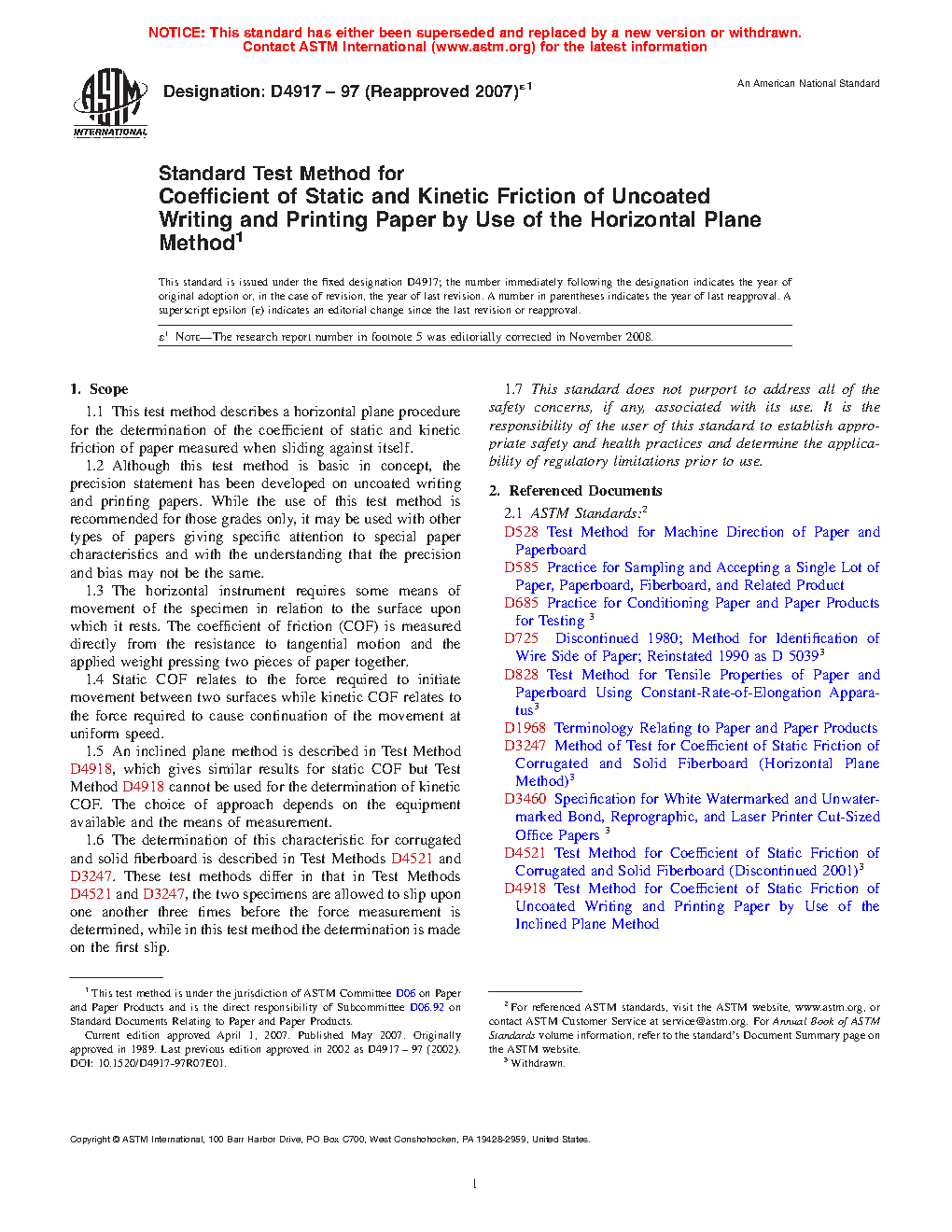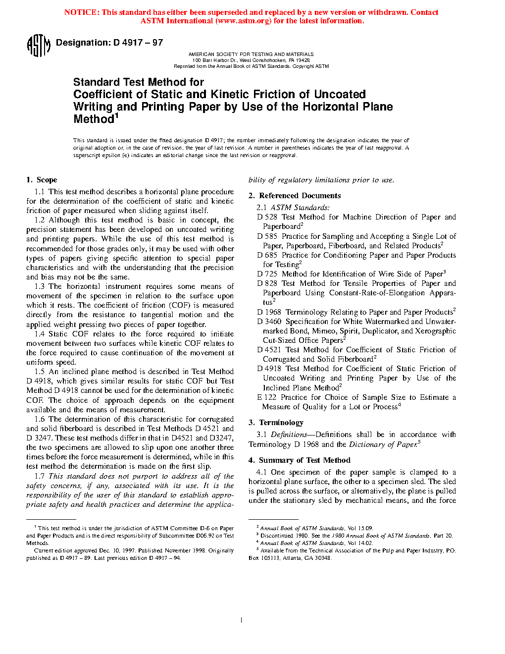 1.1 This test method describes a horizontal plane procedure for the determination of the coefficient of static and kinetic friction of paper measured when sliding against itself.