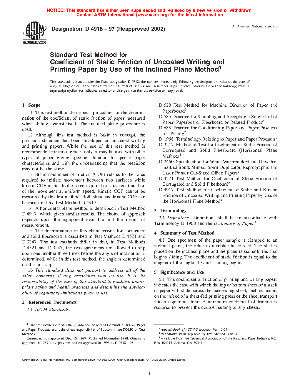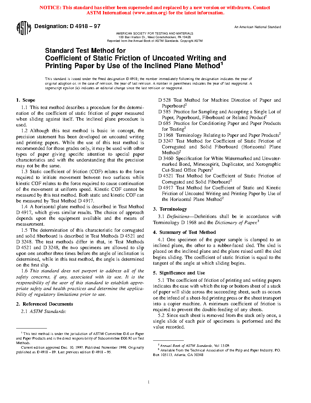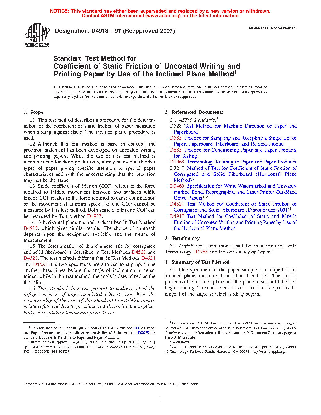 1.1 This test method describes a procedure for the determination of the coefficient of static friction of paper measured when sliding against itself. The inclined plane procedure is used.