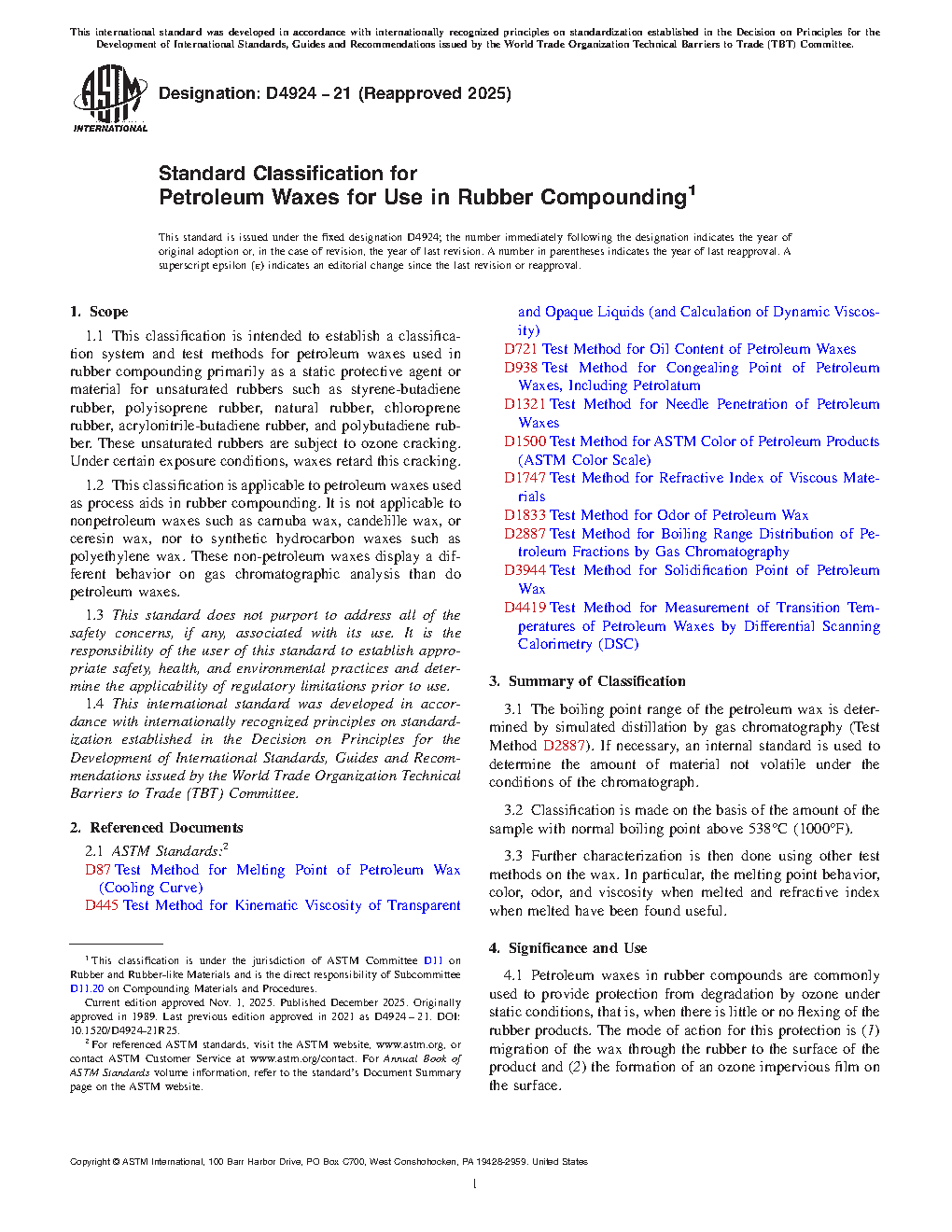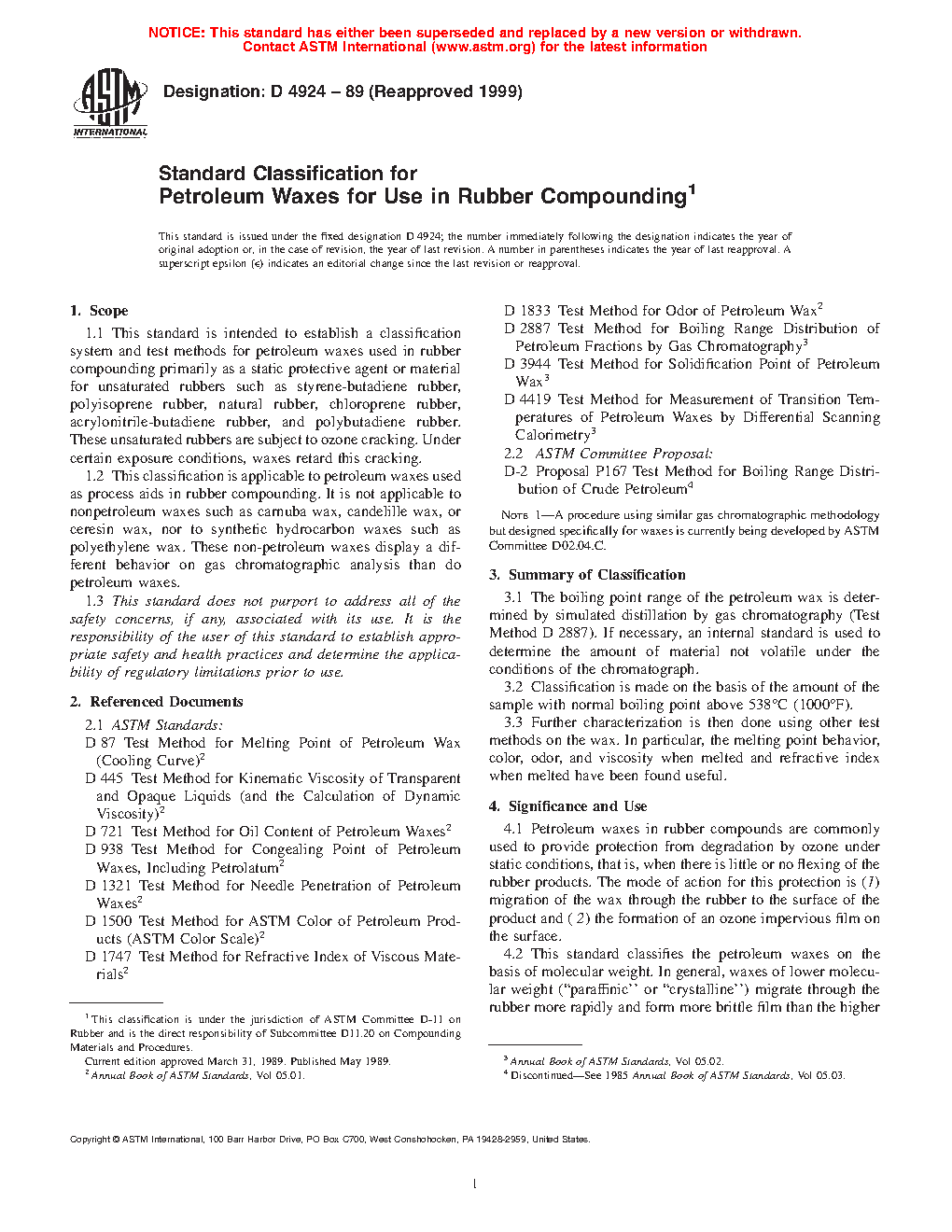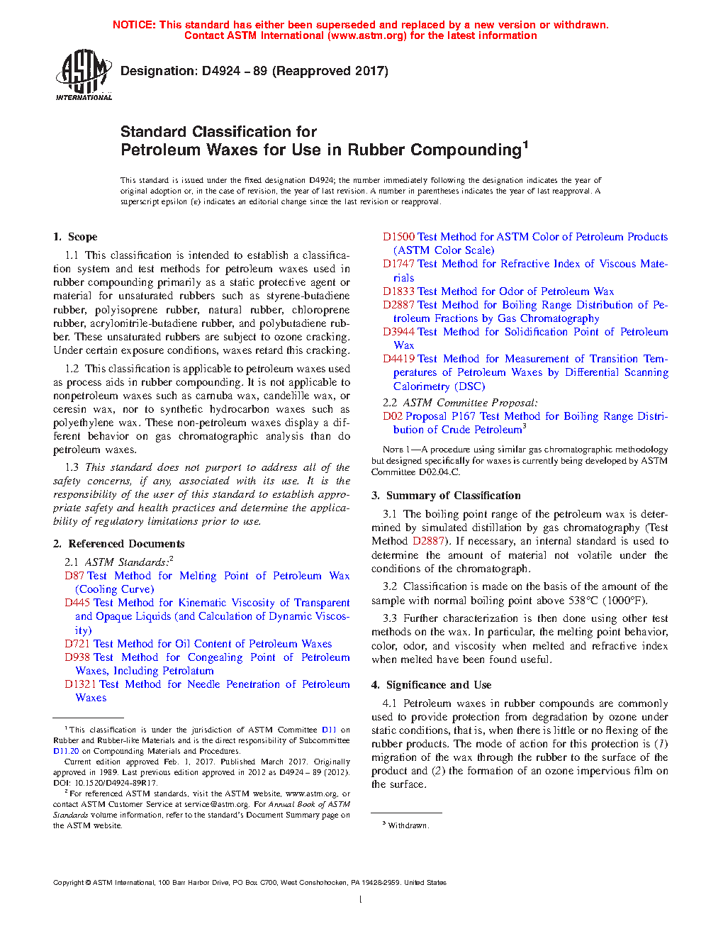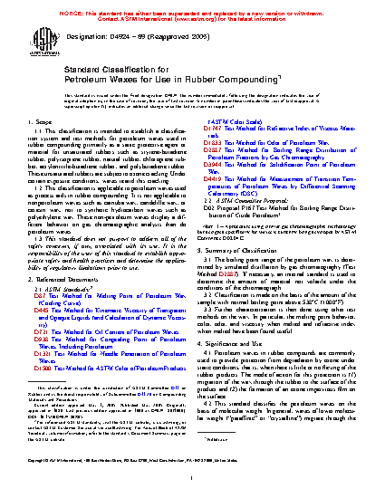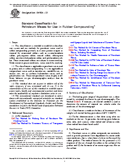 1.1 This classification is intended to establish a classification system and test methods for petroleum waxes used in rubber compounding primarily as a static protective agent or material for unsaturated rubbers such as styrene-butadiene rubber, polyisoprene rubber, natural rubber, chloroprene rubber, acrylonitrile-butadiene rubber, and polybutadiene rubber. These unsaturated rubbers are subject to ozone cracking. Under certain exposure conditions, waxes retard this cracking.