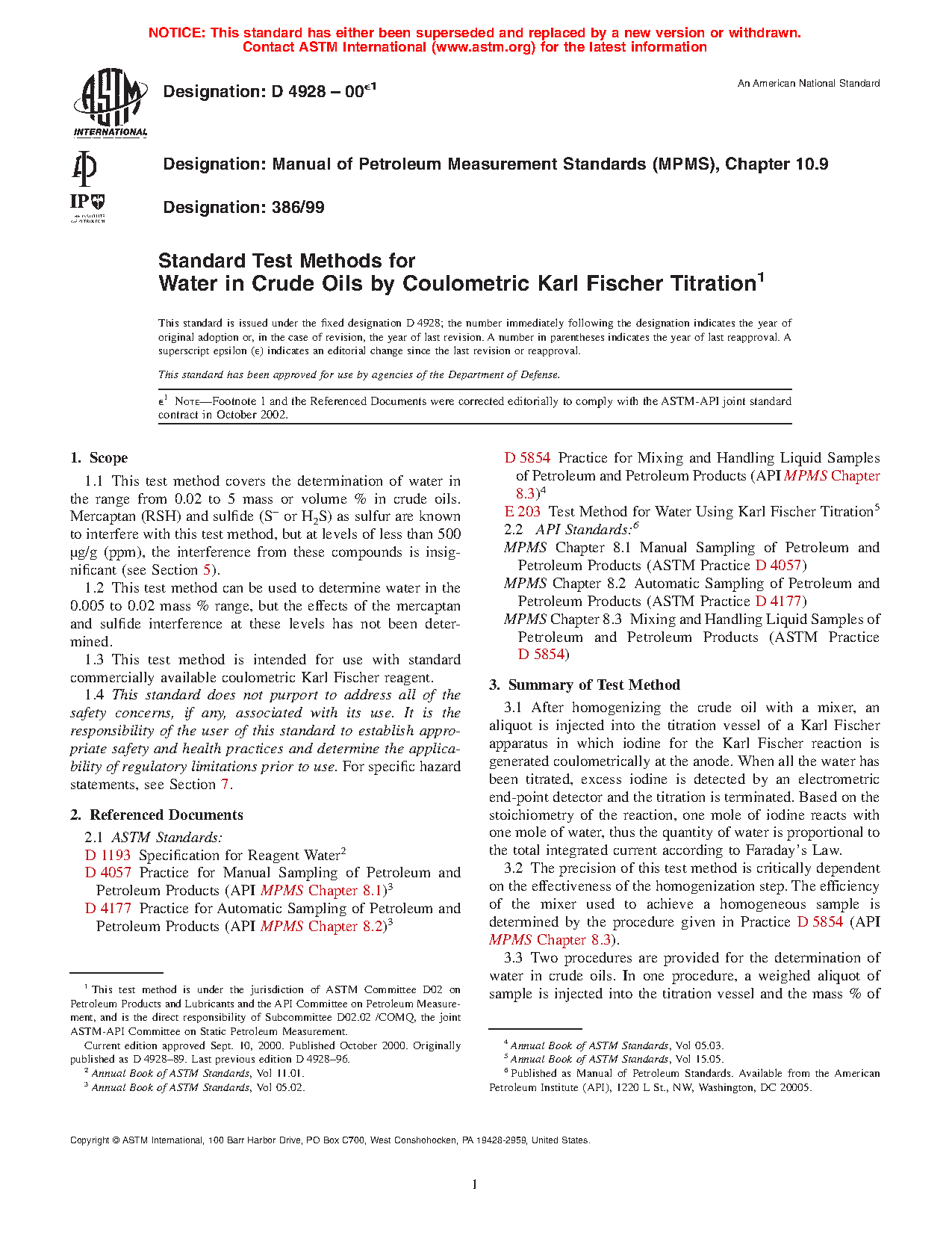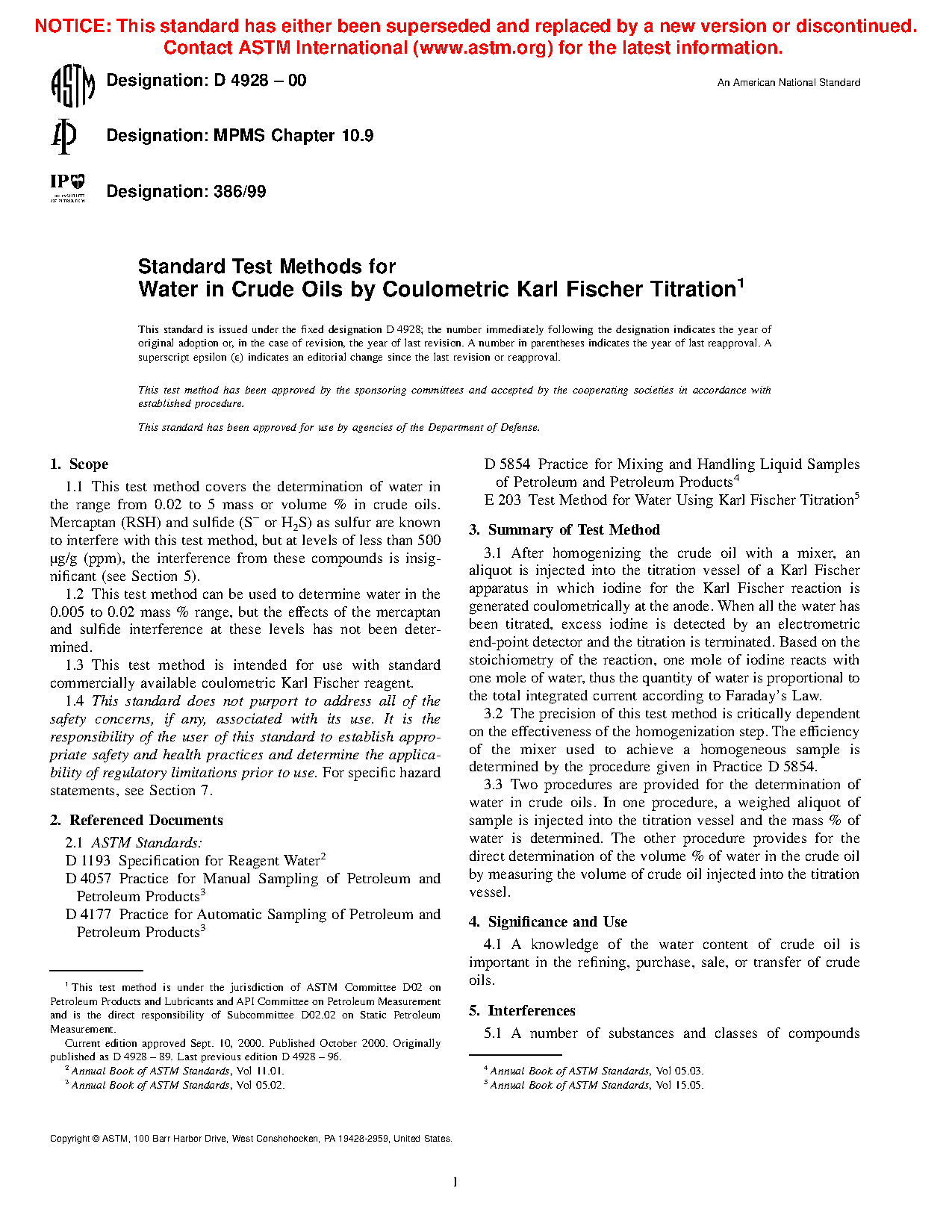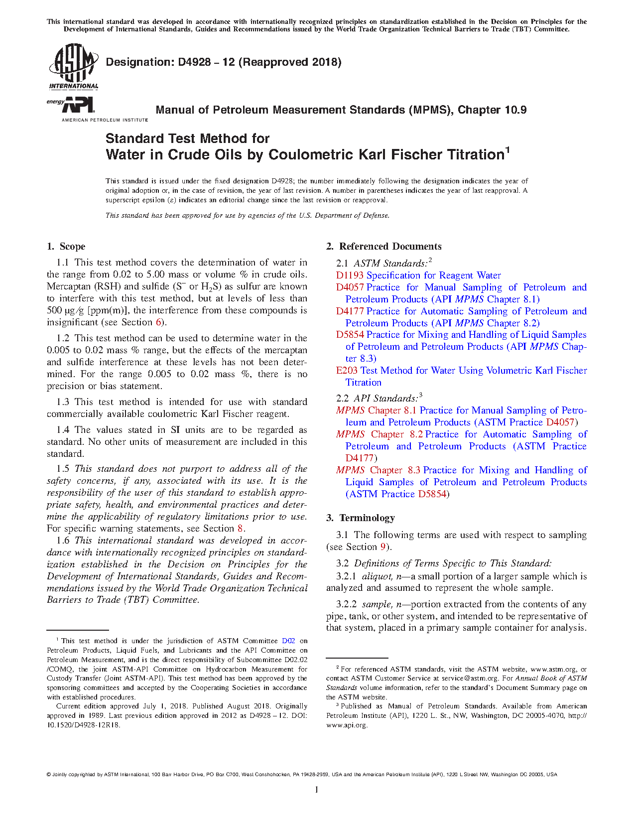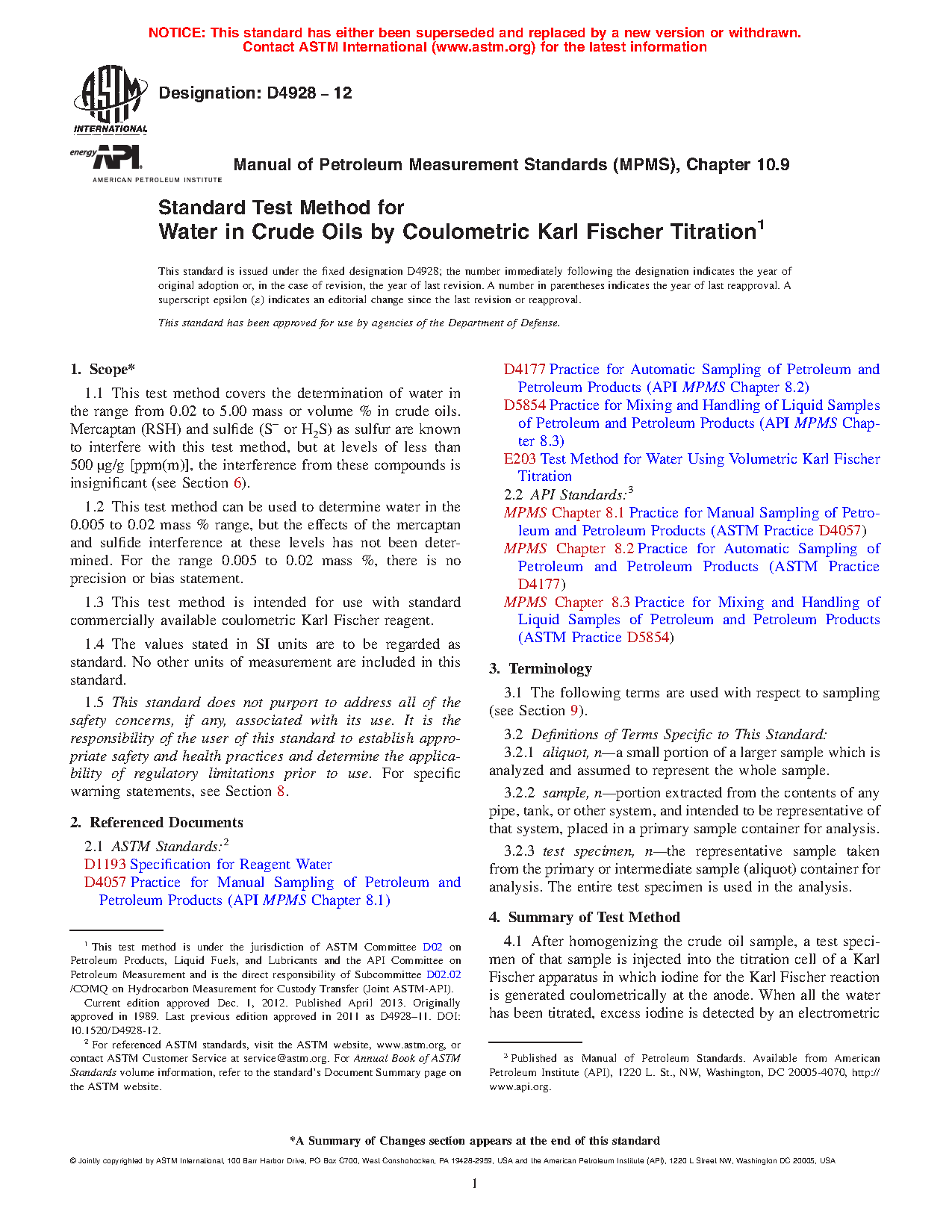 1.1 This test method covers the determination of water in the range from 0.02 to 5 mass or volume % in crude oils. Mercaptan (RSH) and sulfide (S− or H2S) as sulfur are known to interfere with this test method, but at levels of less than 500 μg/g (ppm), the interference from these compounds is insignificant (see Section 5).