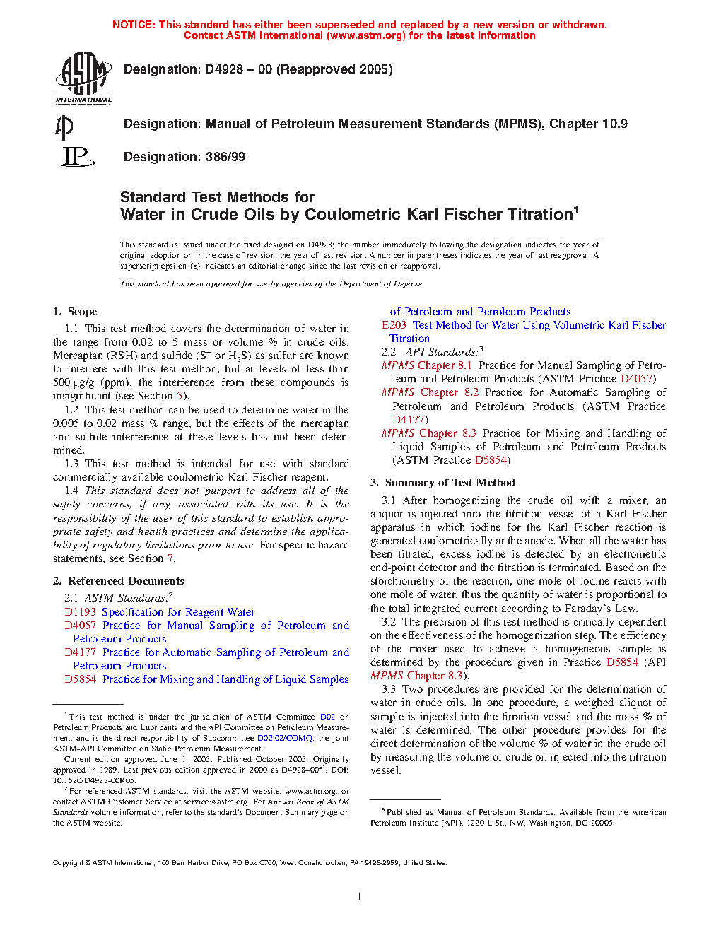 1.5 This standard does not purport to address all of the safety concerns, if any, associated with its use. It is the responsibility of the user of this standard to establish appropriate safety and health practices and determine the applicability of regulatory limitations prior to use. For specific hazard statements, see Section 7. A knowledge of the water content of crude oil is important in the refining, purchase, sale, or transfer of crude oils.