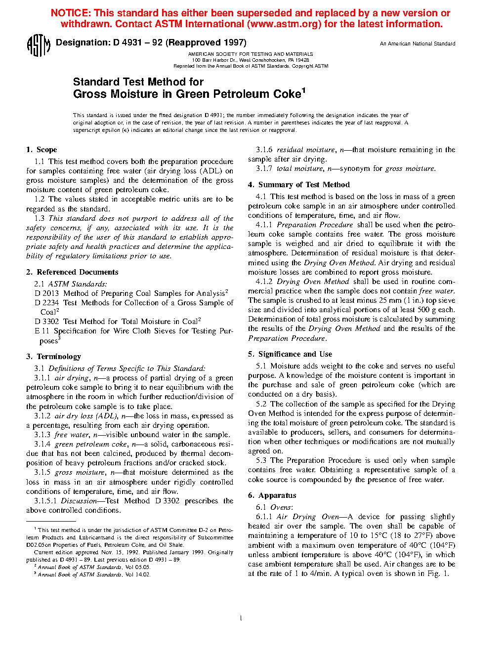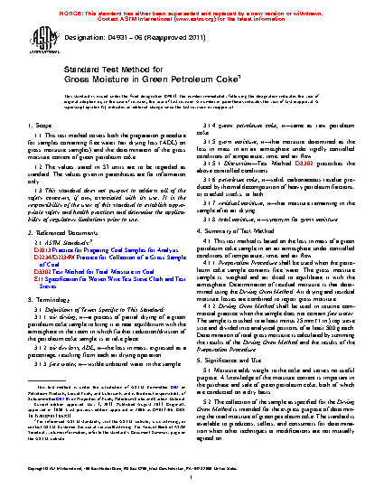1.1 This test method covers both the preparation procedure for samples containing free water (air drying loss (ADL) on gross moisture samples) and the determination of the gross moisture content of green petroleum coke.