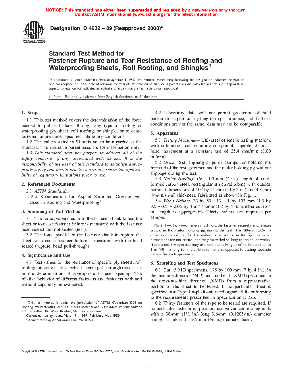 1.1 This test method covers the determination of the force needed to pull a fastener through any type of roofing or waterproofing ply sheet, roll roofing, or shingle, or to cause fastener failure under specified laboratory conditions.