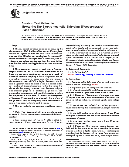 1.1 This test method provides a procedure for measuring the electromagnetic (EM) shielding effectiveness (SE) of a planar material for a plane, far-field EM wave. From the measured data, near-field SE values may be calculated for magnetic (H) sources for electrically thin specimens. , Electric (E) field SE values may also be calculated from this same far-field data, but their validity and applicability have not been established.