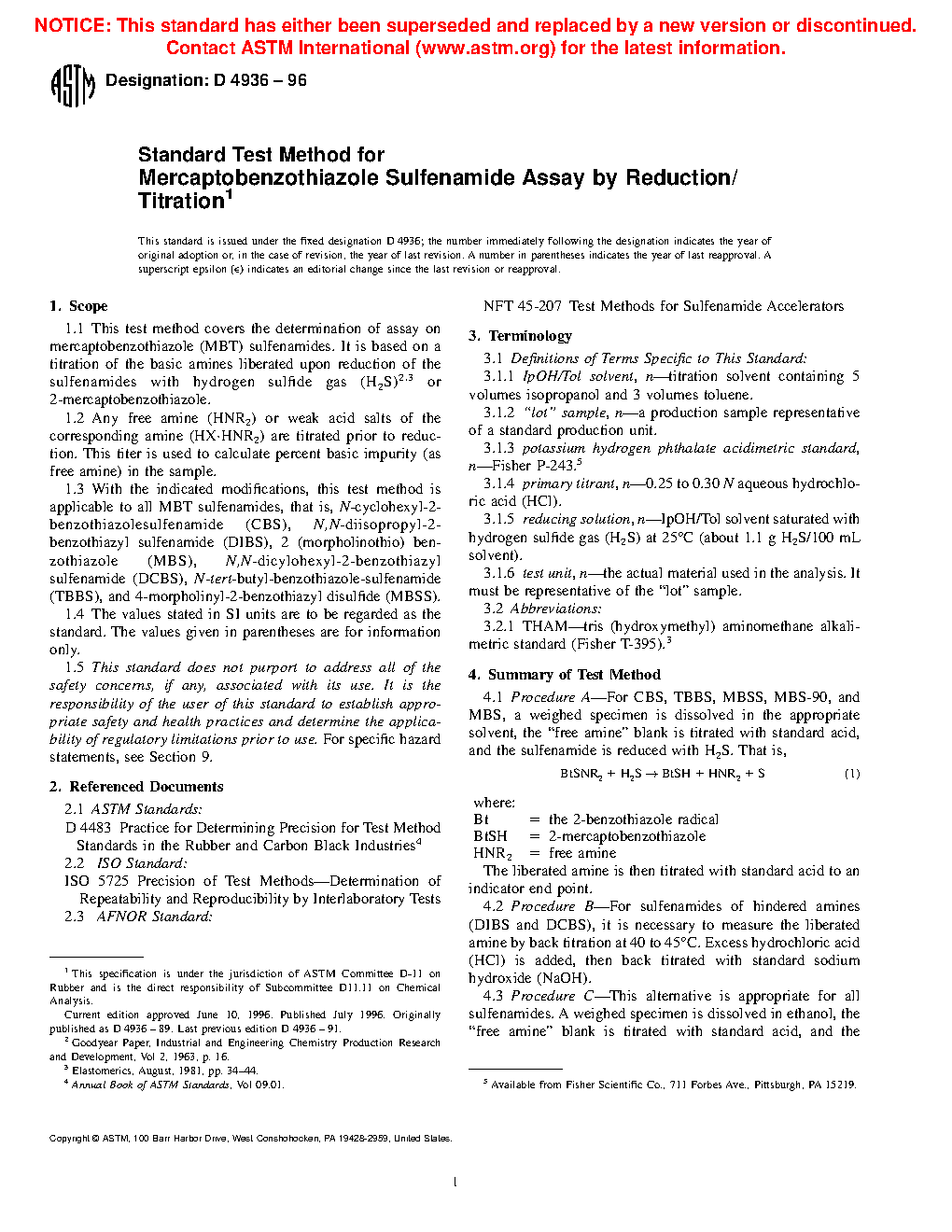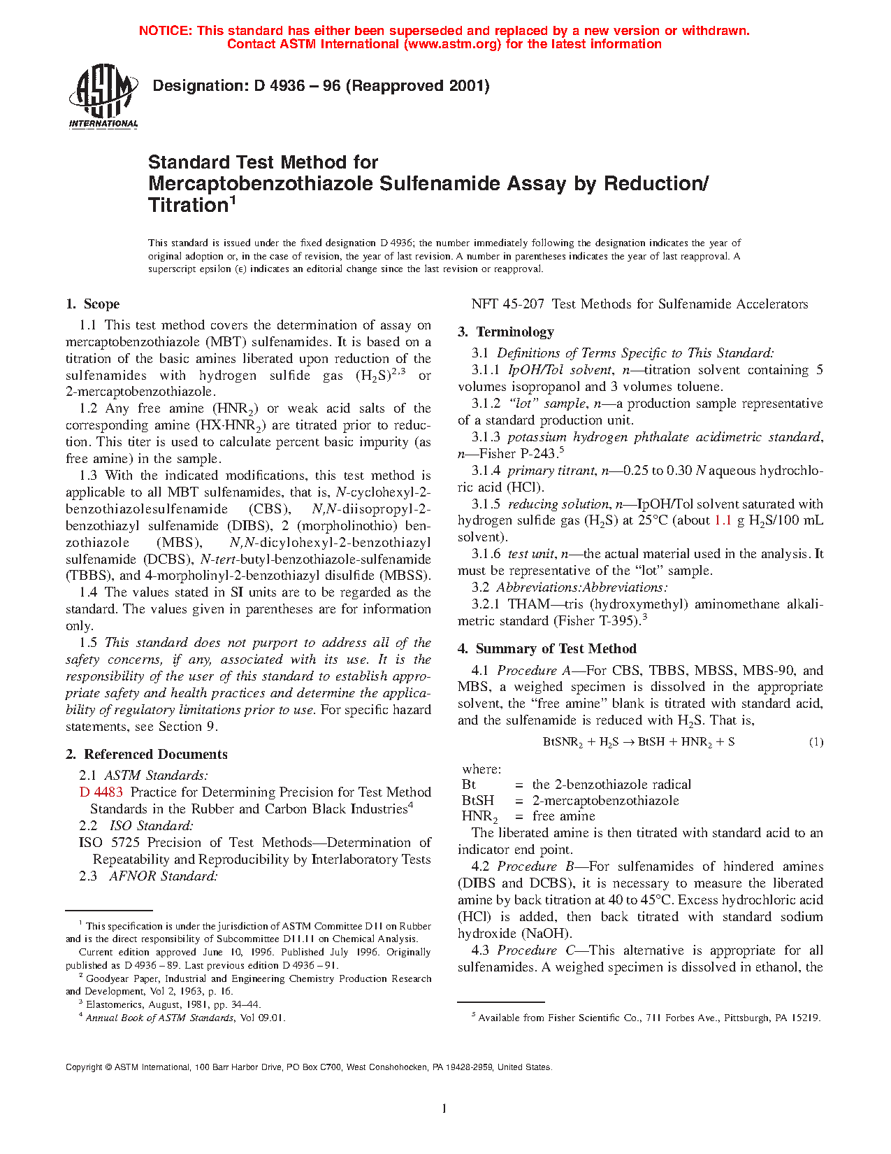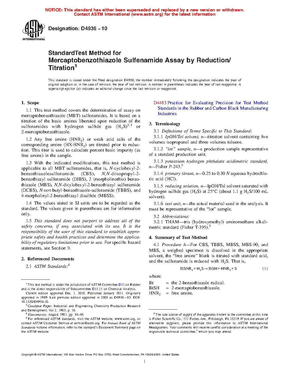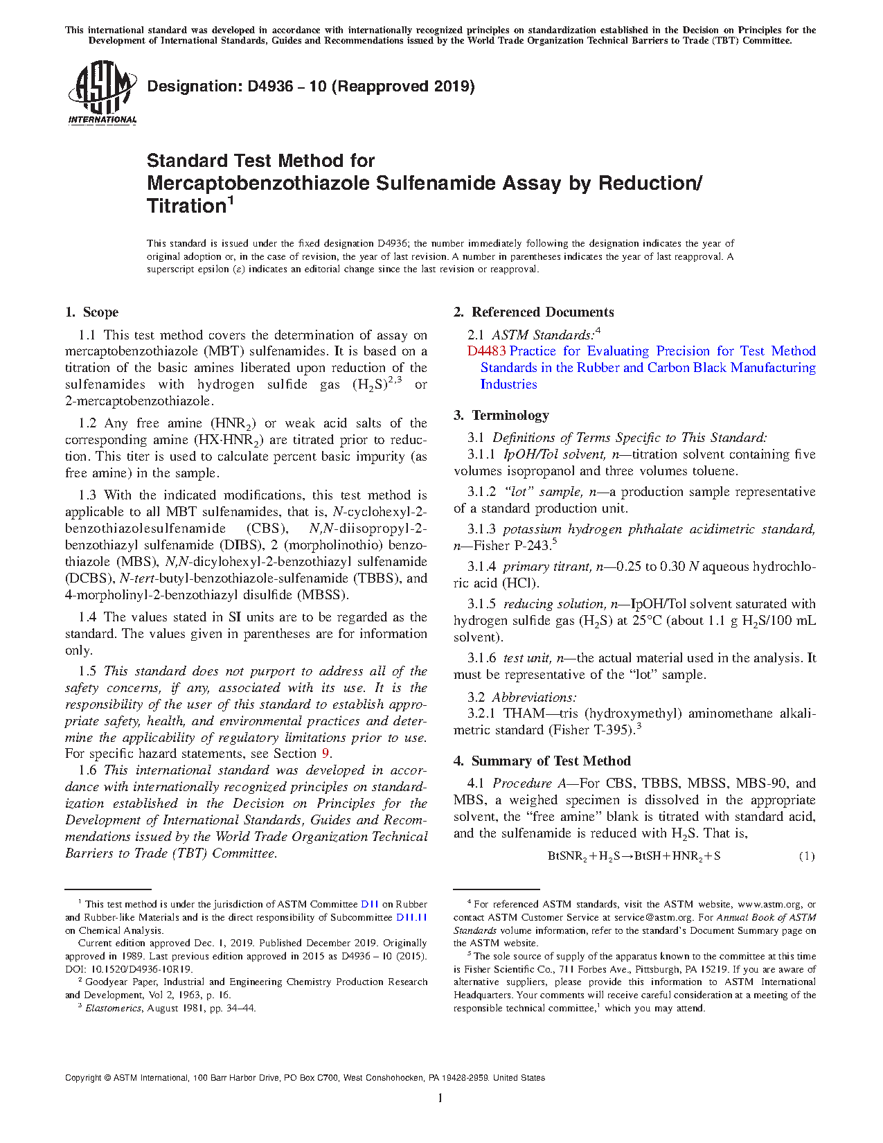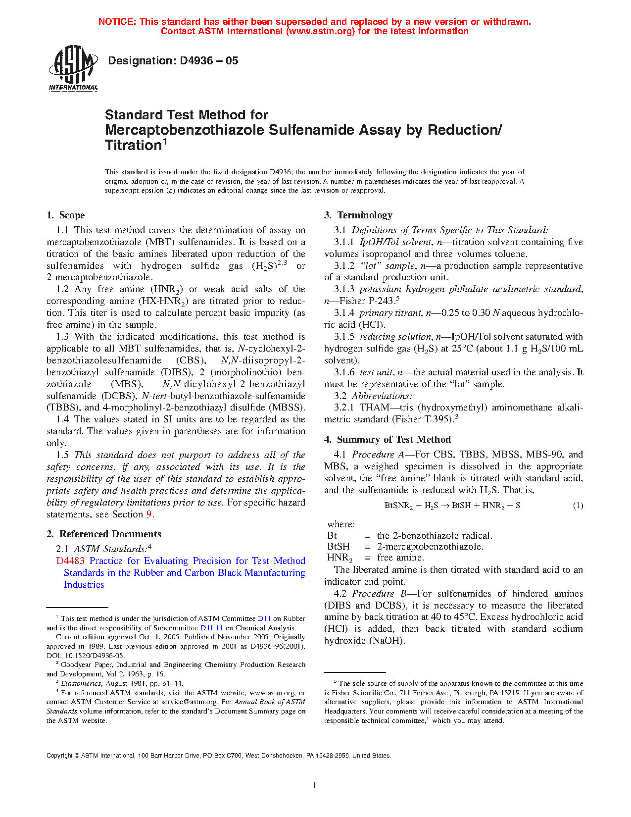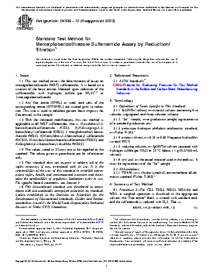 5.1 This test method is designed to assess the purity of 2-mercaptobenzothiazole sulfenamide accelerators. These products are used in combination with sulfur for the vulcanization of rubber.