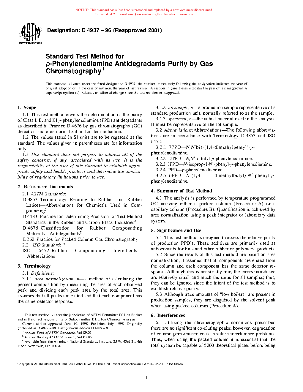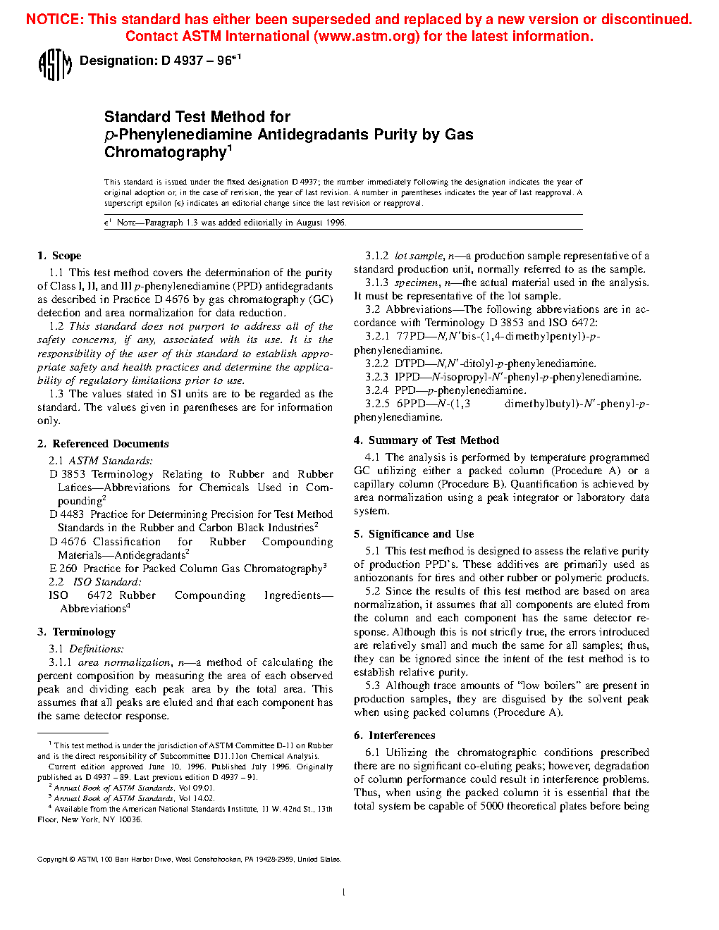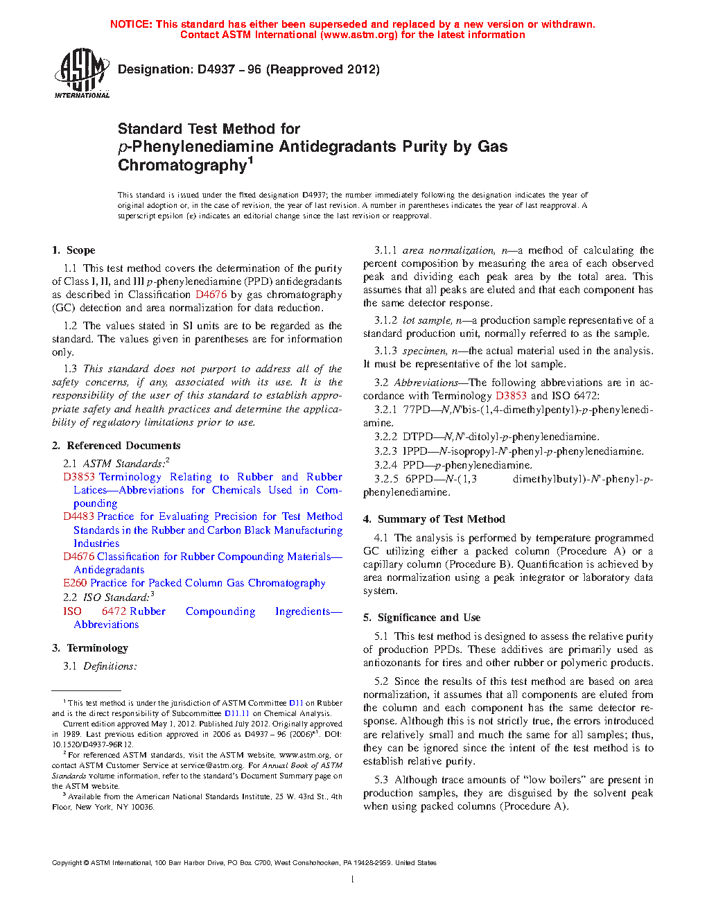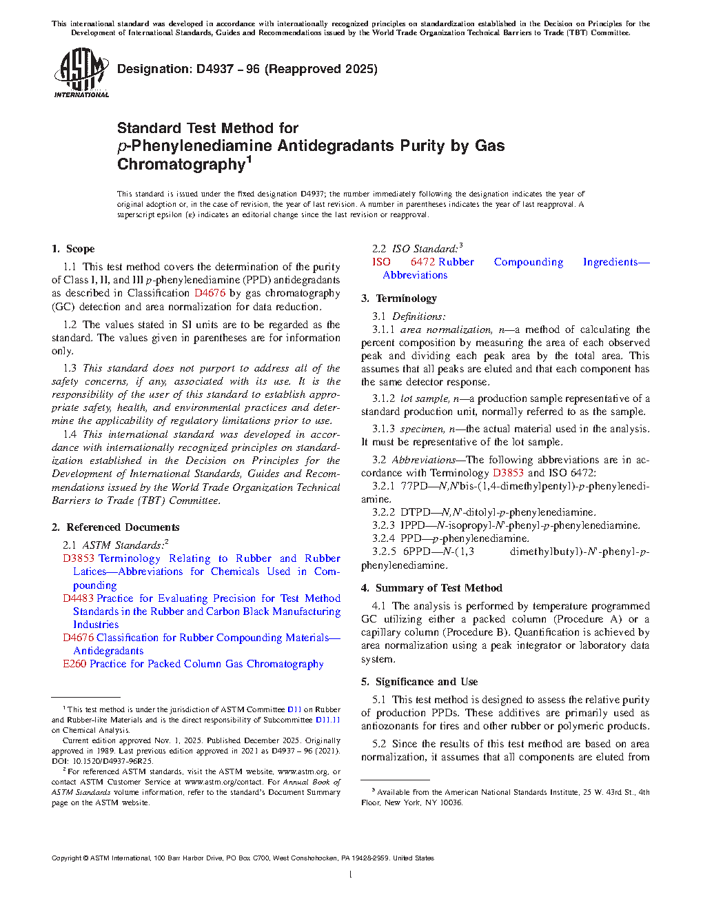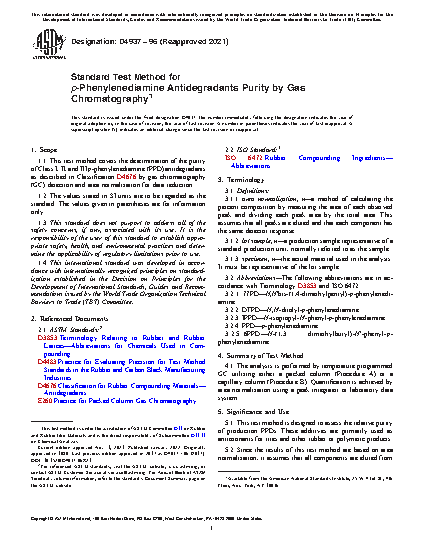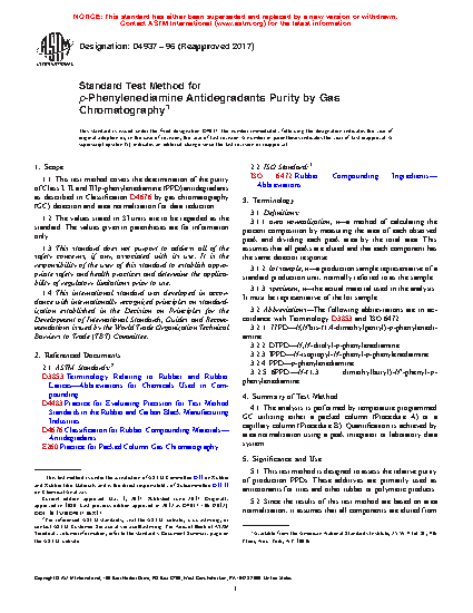 1.1 This test method covers the determination of the purity of Class I, II, and III p-phenylenediamine (PPD) antidegradants as described in Classification D4676 by gas chromatography (GC) detection and area normalization for data reduction.